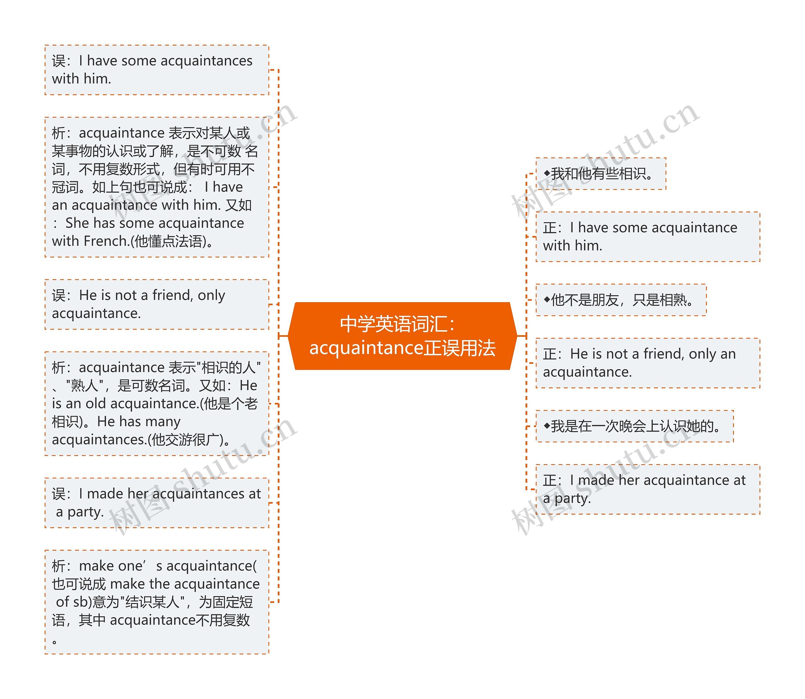 析:acquaintance 表示"相识的人"、"熟人",是可数名词。又如:He is an old acquaintance.(他是个老相识)。He has many acquaintances.(他交游很广)。