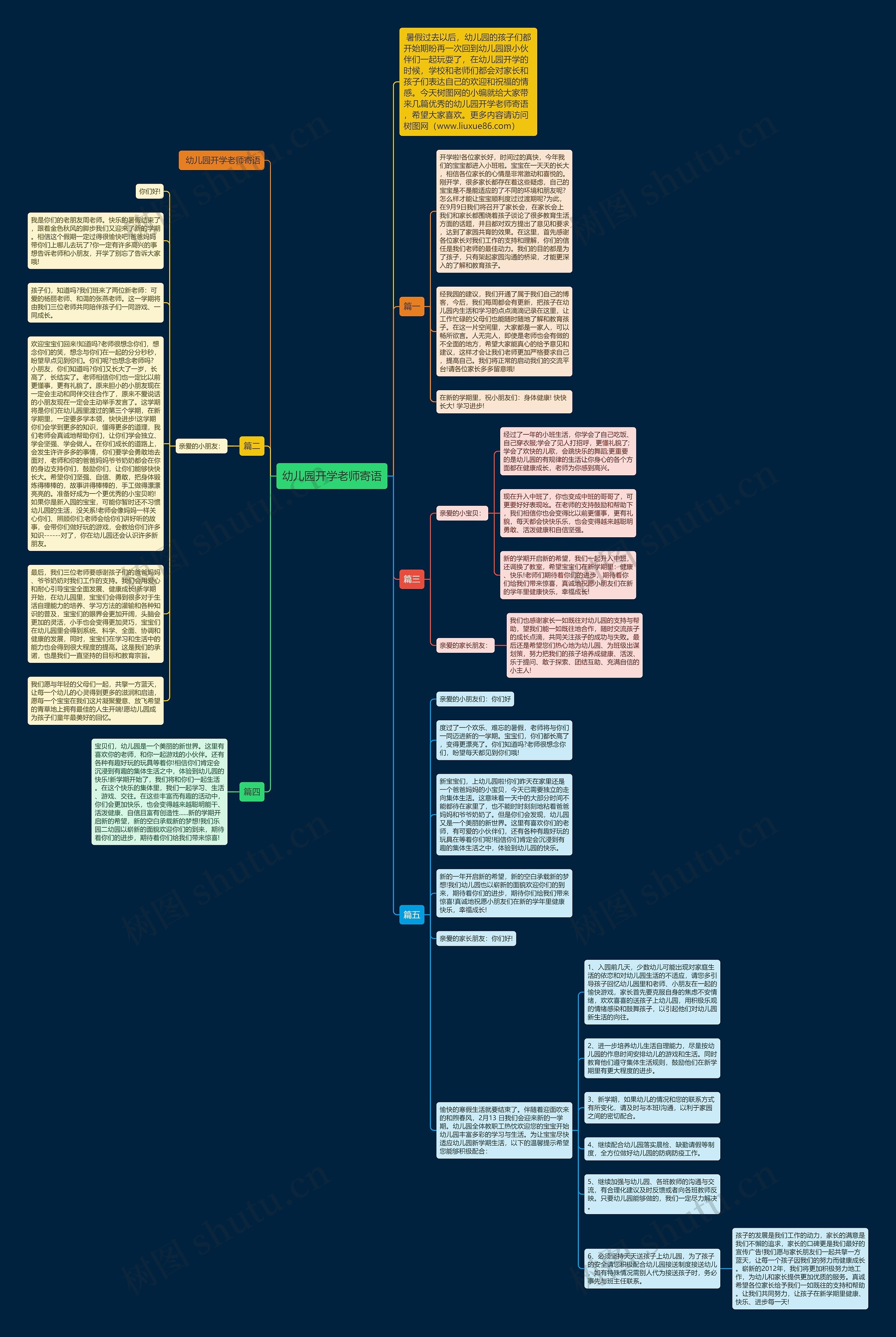 欢迎宝宝们回来!知道吗?老师很想念你们,想念你们的笑,想念与你们在一起的分分秒秒,盼望早点见到你们。你们呢?也想念老师吗? 小朋友,你们知道吗?你们又长大了一岁,长高了,长结实了。老师相信你们也一定比以前更懂事,更有礼貌了。原来胆小的小朋友现在一定会主动和同伴交往合作了,原来不爱说话的小朋友现在一定会主动举手发言了。这学期将是你们在幼儿园里渡过的第三个学期,在新学期里,一定要多学本领,快快进步!这学期你们会学到更多的知识,懂得更多的道理,我们老师会真诚地帮助你们,让你们学会独立、学会坚强、学会做人。在你们成长的道路上,会发生许许多多的事情,你们要学会勇敢地去面对,老师和你的爸爸妈妈爷爷奶奶都会在你的身边支持你们,鼓励你们,让你们能够快快长大。希望你们坚强、自信、勇敢,把身体锻炼得棒棒的,故事讲得棒棒的,手工做得漂漂亮亮的。准备好成为一个更优秀的小宝贝哟!如果你是新入园的宝宝,可能你暂时还不习惯幼儿园的生活,没关系!老师会像妈妈一样关心你们、照顾你们;老师会给你们讲好听的故事,会带你们做好玩的游戏,会教给你们许多知识------对了,你在幼儿园还会认识许多新朋友。