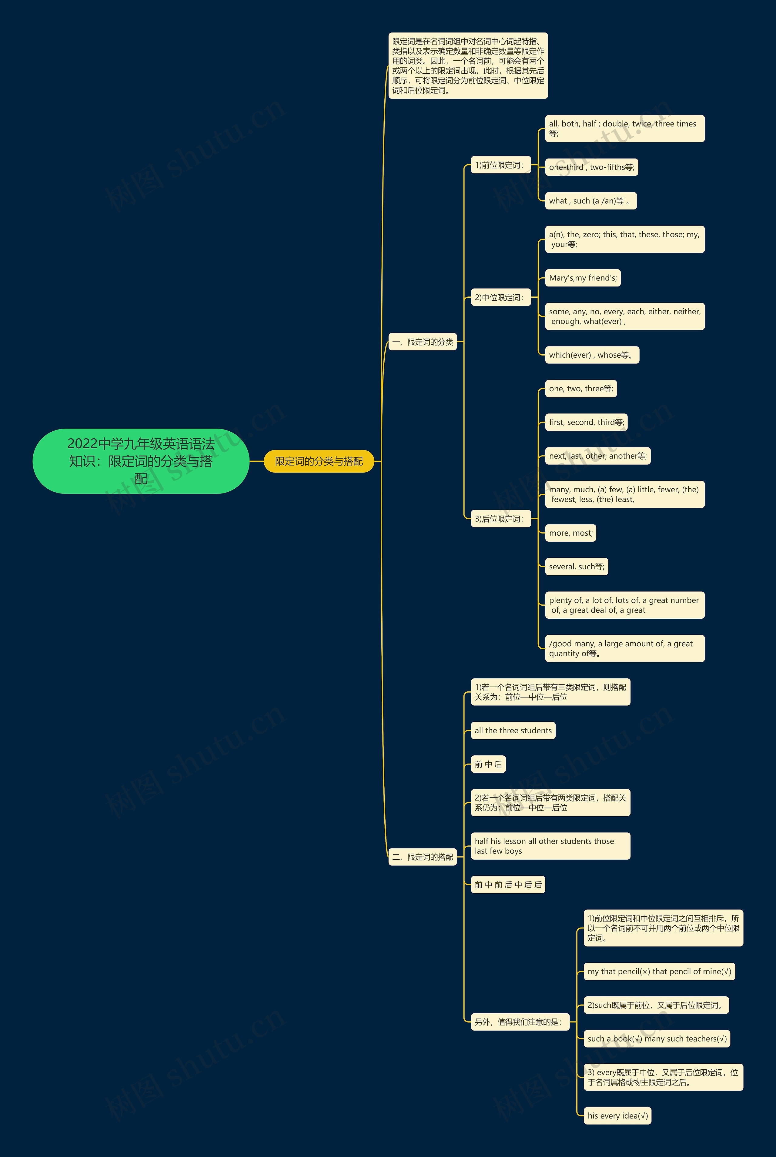 树图思维导图提供《2022中学九年级英语语法知识:限定词的分类与搭配》在线思维导图免费制作,点击“编辑”按钮,可对《2022中学九年级英语语法知识:限定词的分类与搭配》进行在线思维导图编辑,本思维导图属于思维导图模板主题,文件编号是:fe1ec0dfa8aa4617f4caaa58d2fd31b9