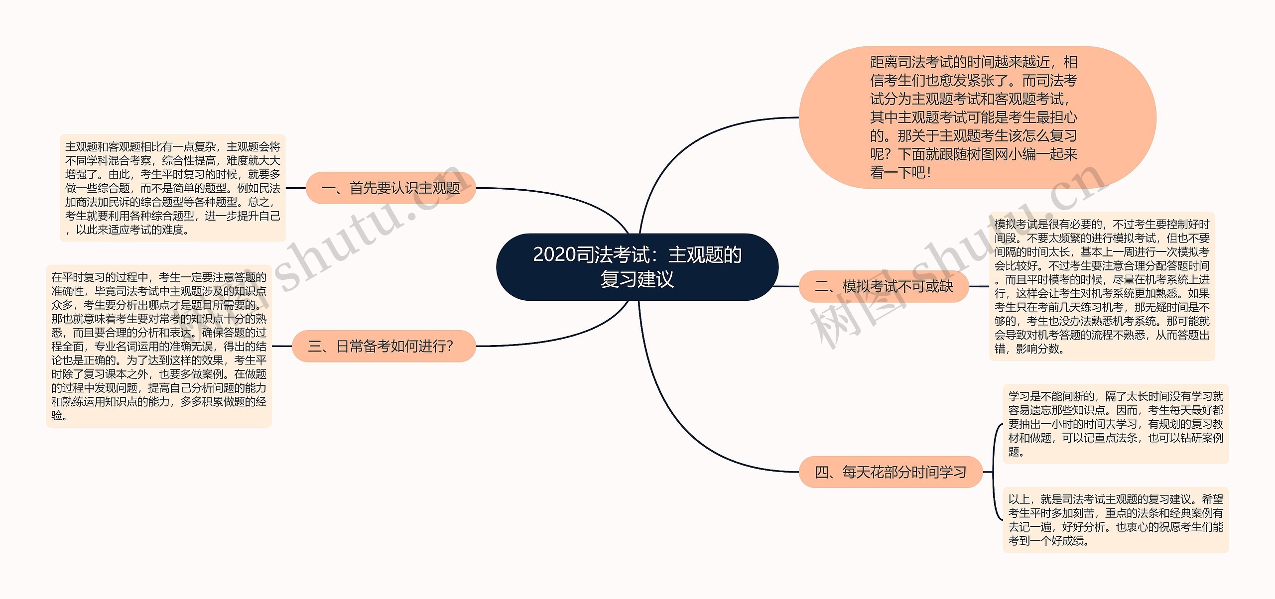 树图思维导图提供《2020司法考试:主观题的复习建议》在线思维导图免费制作,点击“编辑”按钮,可对《2020司法考试:主观题的复习建议》进行在线思维导图编辑,本思维导图属于思维导图模板主题,文件编号是:4a367fcdc66037dd4d1113e082323cfc