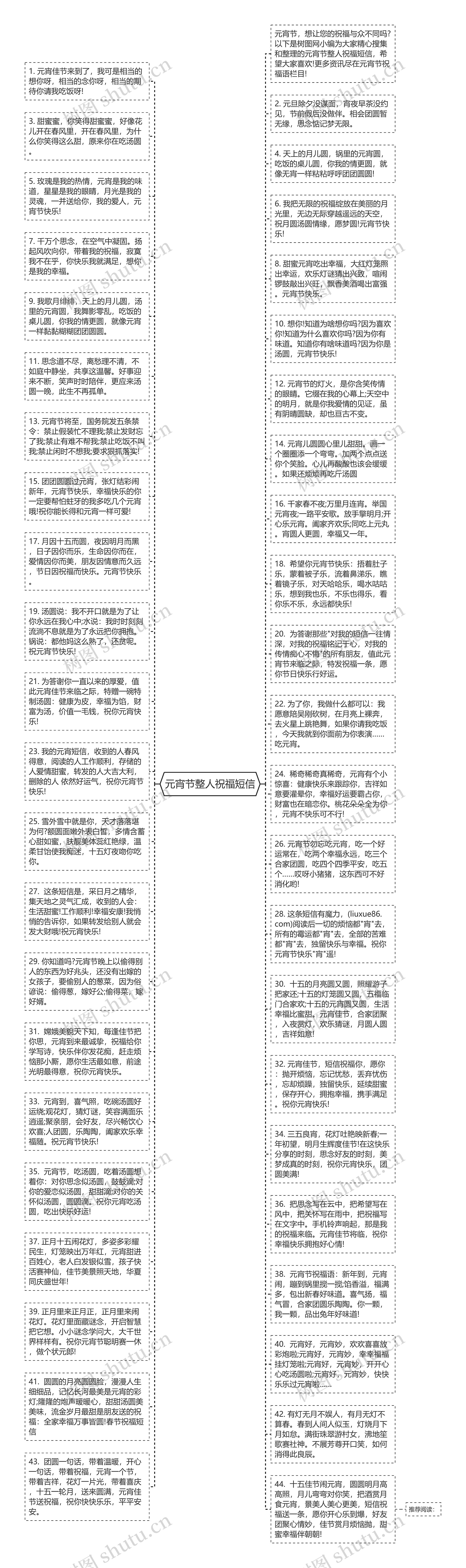 30. 十五的月亮圆又圆,照耀游子把家还;十五的灯笼圆又圆,五福临门合家欢;十五的元宵圆又圆,生活幸福比蜜甜。元宵佳节,合家团聚,入夜赏灯,欢乐猜谜,月圆人圆,吉祥如意!