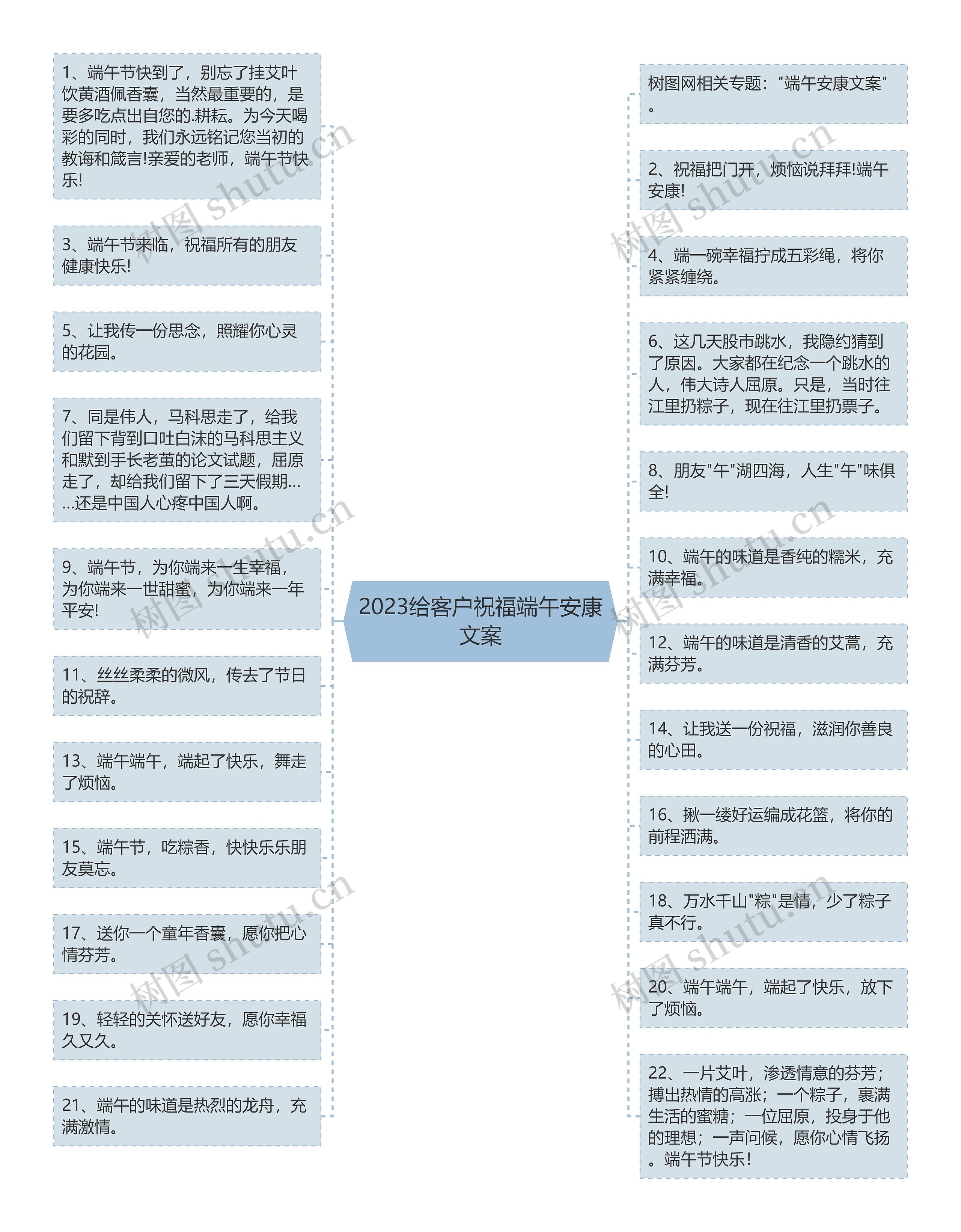 树图思维导图提供《2023给客户祝福端午安康文案》在线思维导图免费制作,点击“编辑”按钮,可对《2023给客户祝福端午安康文案》进行在线思维导图编辑,本思维导图属于思维导图模板主题,文件编号是:c4b11c6fd2c82e086d7bf92513d1f70a