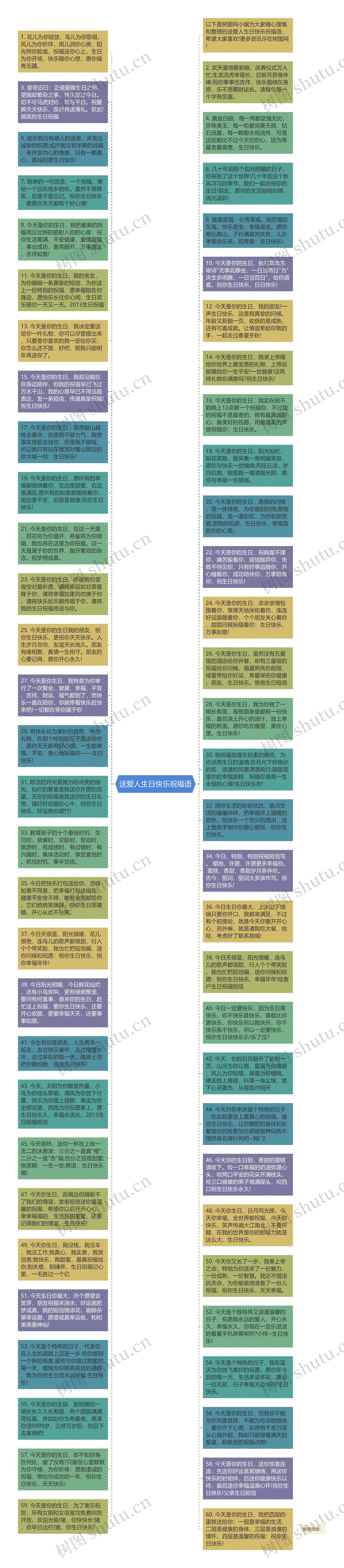 1. 花儿为你绽放,鸟儿为你歌唱,风儿为你祈祥,雨儿润你心房,阳光照你脸庞,祝福送你心上,生日为你开场,快乐随你心想,愿你福寿无疆。