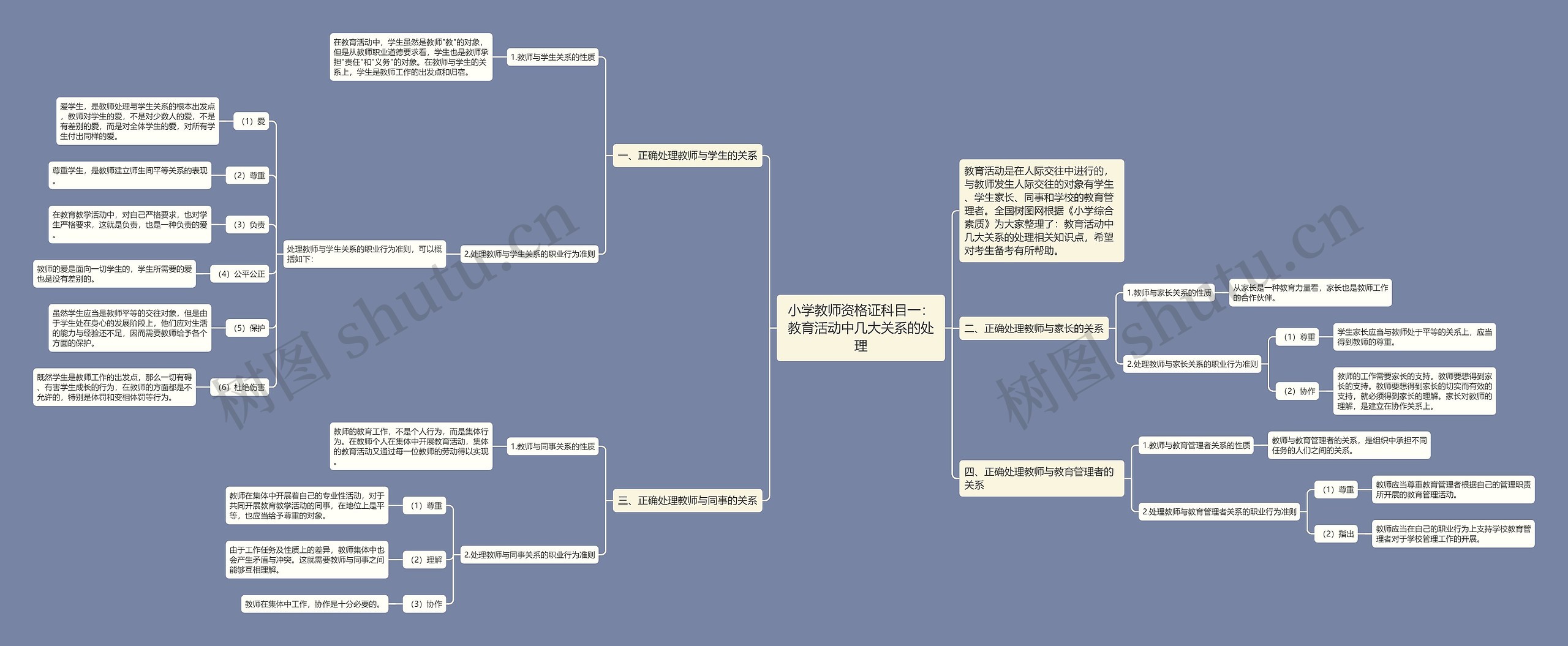 树图思维导图提供《小学教师资格证科目一:教育活动中几大关系的处理》在线思维导图免费制作,点击“编辑”按钮,可对《小学教师资格证科目一:教育活动中几大关系的处理》进行在线思维导图编辑,本思维导图属于思维导图模板主题,文件编号是:61d6244d637ca67065d259df3c358df8