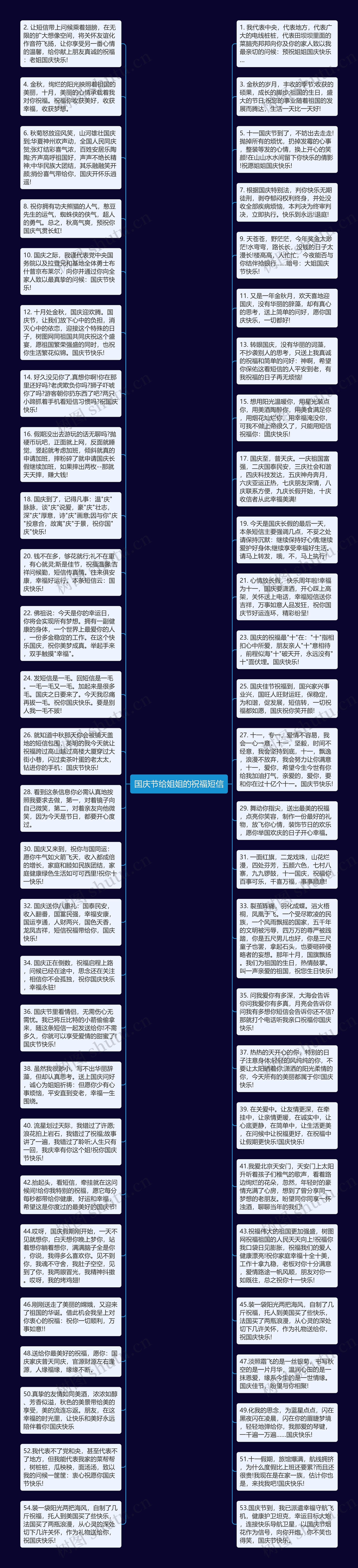 2. 让短信带上问候乘着翅膀,在无限的扩大想像空间,将关怀友谊化作音符飞扬,让你享受另一番心情的温馨,给你献上朋友真诚的祝福:老姐国庆快乐!