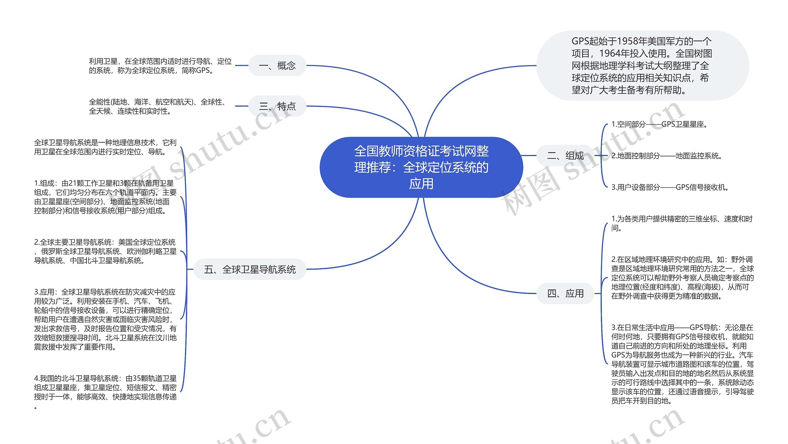 树图思维导图提供《全国教师资格证考试网整理推荐:全球定位系统的应用》在线思维导图免费制作,点击“编辑”按钮,可对《全国教师资格证考试网整理推荐:全球定位系统的应用》进行在线思维导图编辑,本思维导图属于思维导图模板主题,文件编号是:9c18d3b9fa71e93436bd38e8c3ebafa3