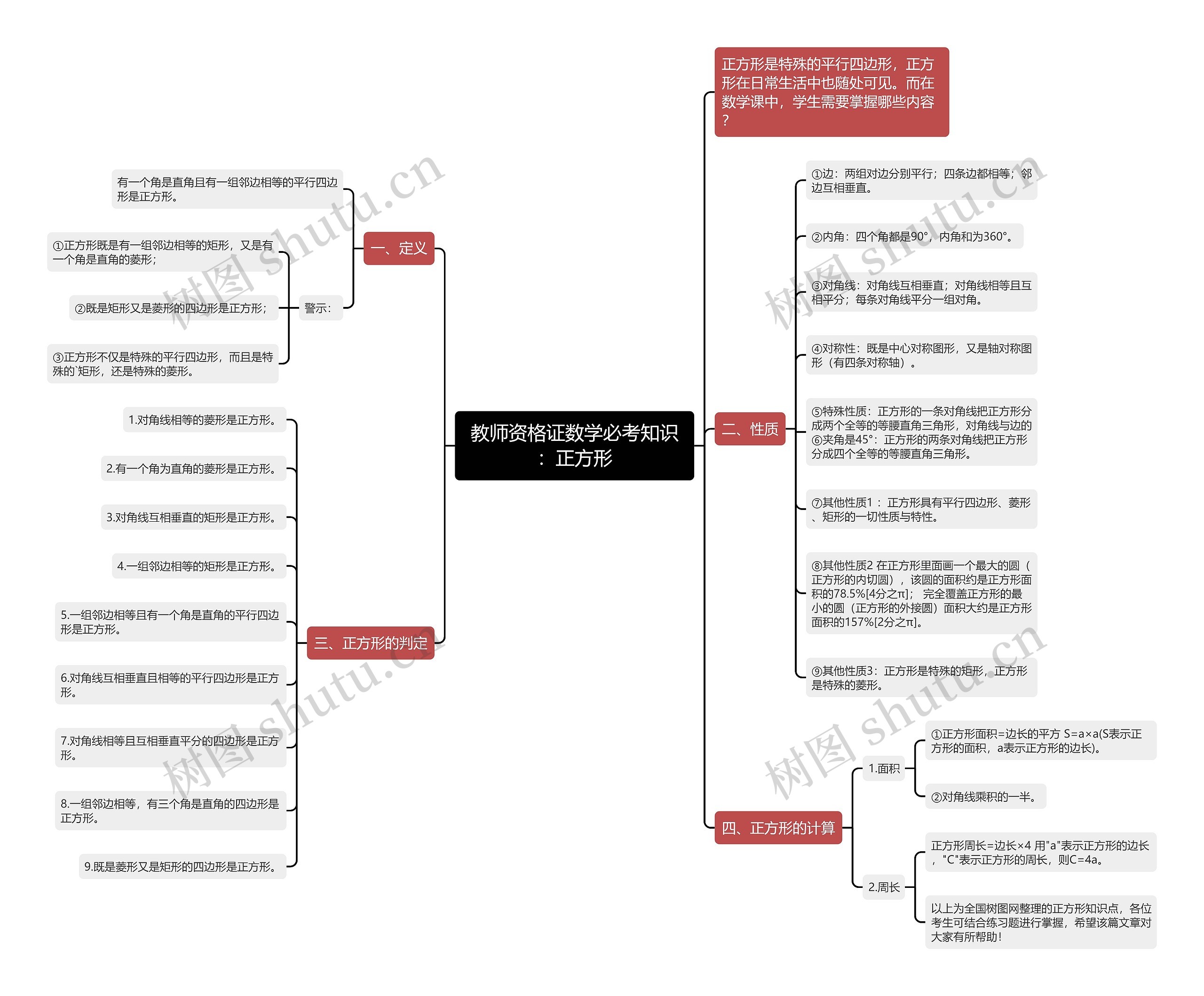 教师资格证数学必考知识:正方形思维导图,正方形是特殊的平行四边形,定义要求有一个角是直角且有一组邻边相等,掌握正方形的定义至关重要,注意警示:正方形不仅是特殊的平行四边形,而且是特殊的矩形、菱形。正方形具有许多性质,如边、内角、对角线、对称性、特殊性质,正方形的判定有九种情况,正方形的计算包含面积和周长两个方面,应该掌握正方形面积=边长的平方和周长=边长×4等公式,通过练习题,加深理解,将有助于考生在教师资格证数学考试中获得更好的成绩。