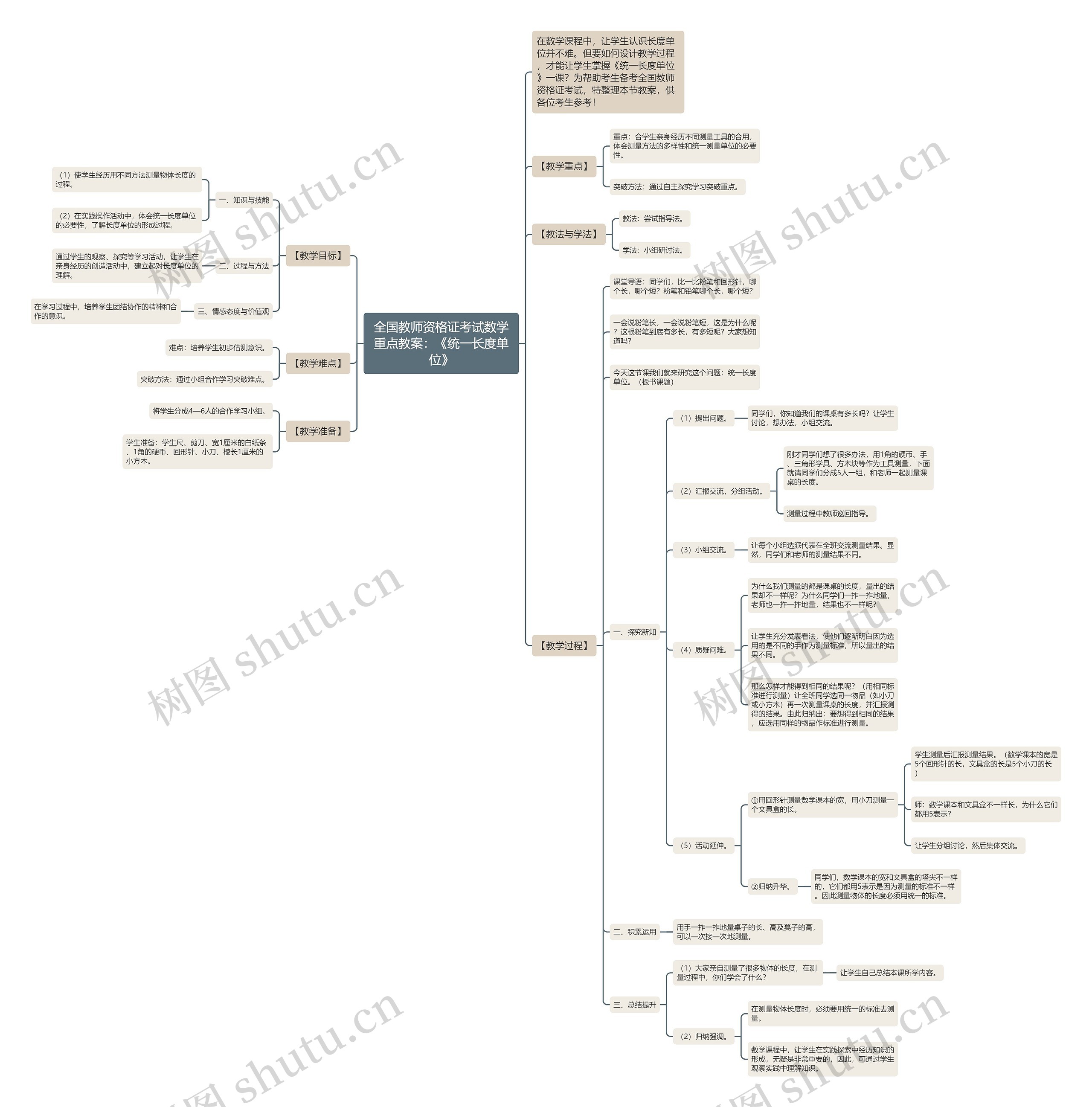 全国教师资格证考试数学重点教案:《统一长度单位》思维导图该教案的教学目标是使学生经历用不同方法测量物体长度的过程,在实践操作活动中,体会统一长度单位的必要性,了解长度单位的形成过程。教学重点是让学生通过多样性的测量方法和统一测量单位的必要性,建立对长度单位的理解,教学难点在于培养学生的初步估测意识,通过小组合作学习来突破,教法是尝试指导法,学法是小组研讨法。教学过程中,通过思考新知、汇报交流、分组活动、小组交流、质疑问难和活动延伸,让学生通过实践和思考掌握长度单位的概念和应用。
