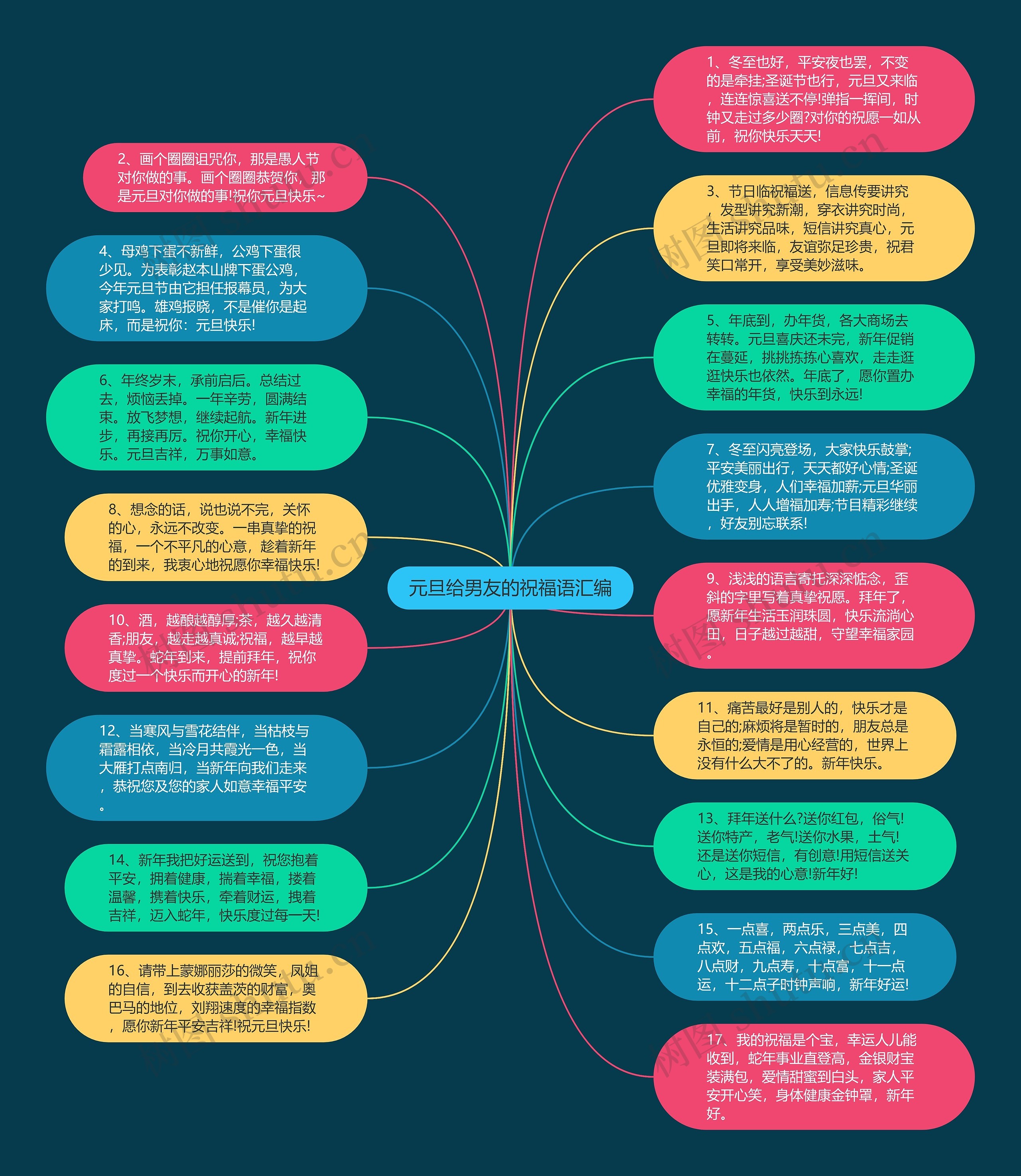 15、一点喜,两点乐,三点美,四点欢,五点福,六点禄,七点吉,八点财,九点寿,十点富,十一点运,十二点子时钟声响,新年好运!