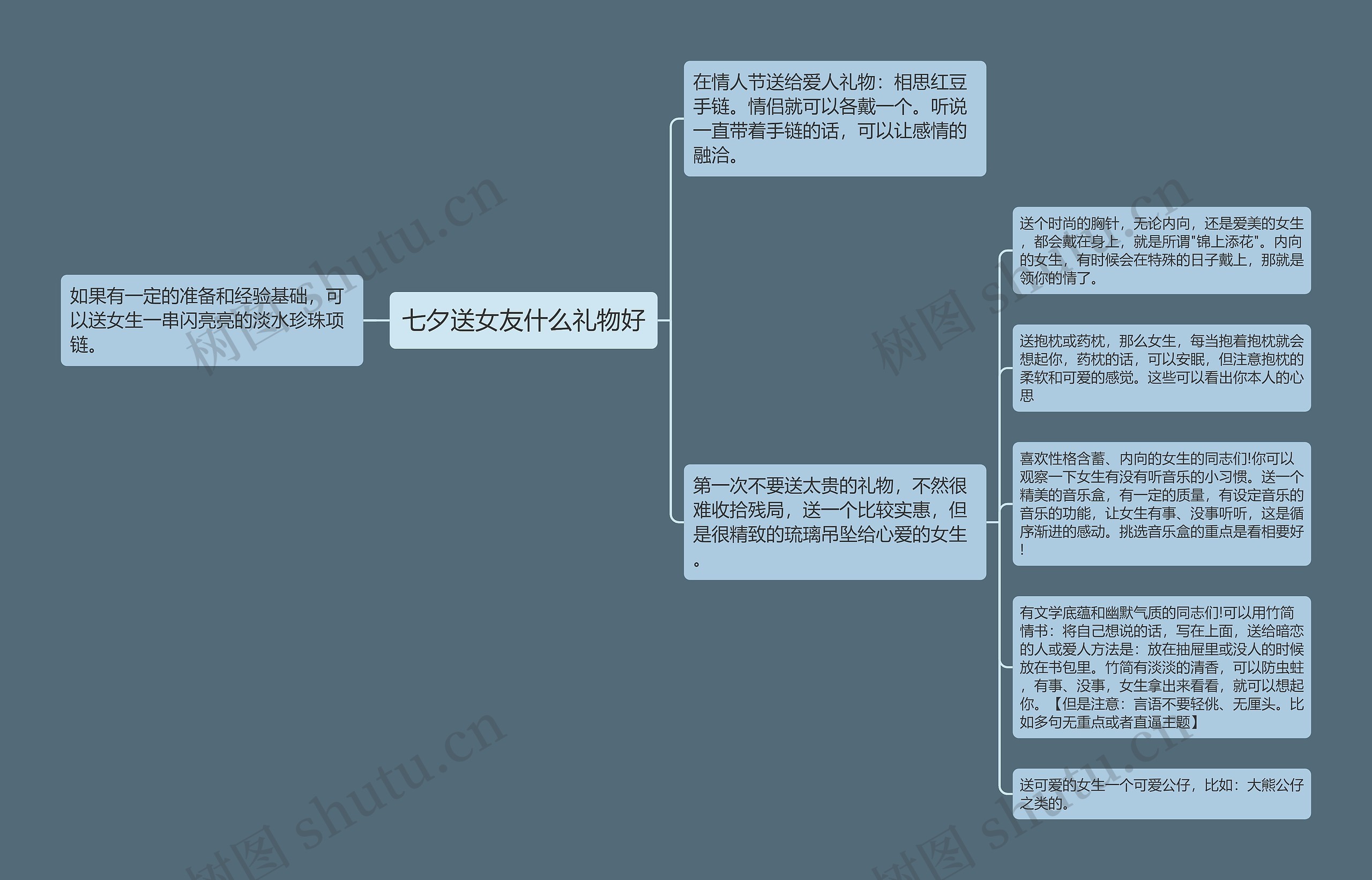 树图思维导图提供《七夕送女友什么礼物好》在线思维导图免费制作,点击“编辑”按钮,可对《七夕送女友什么礼物好》进行在线思维导图编辑,本思维导图属于思维导图模板主题,文件编号是:75f0bdc89068c2593017992e1793cb05