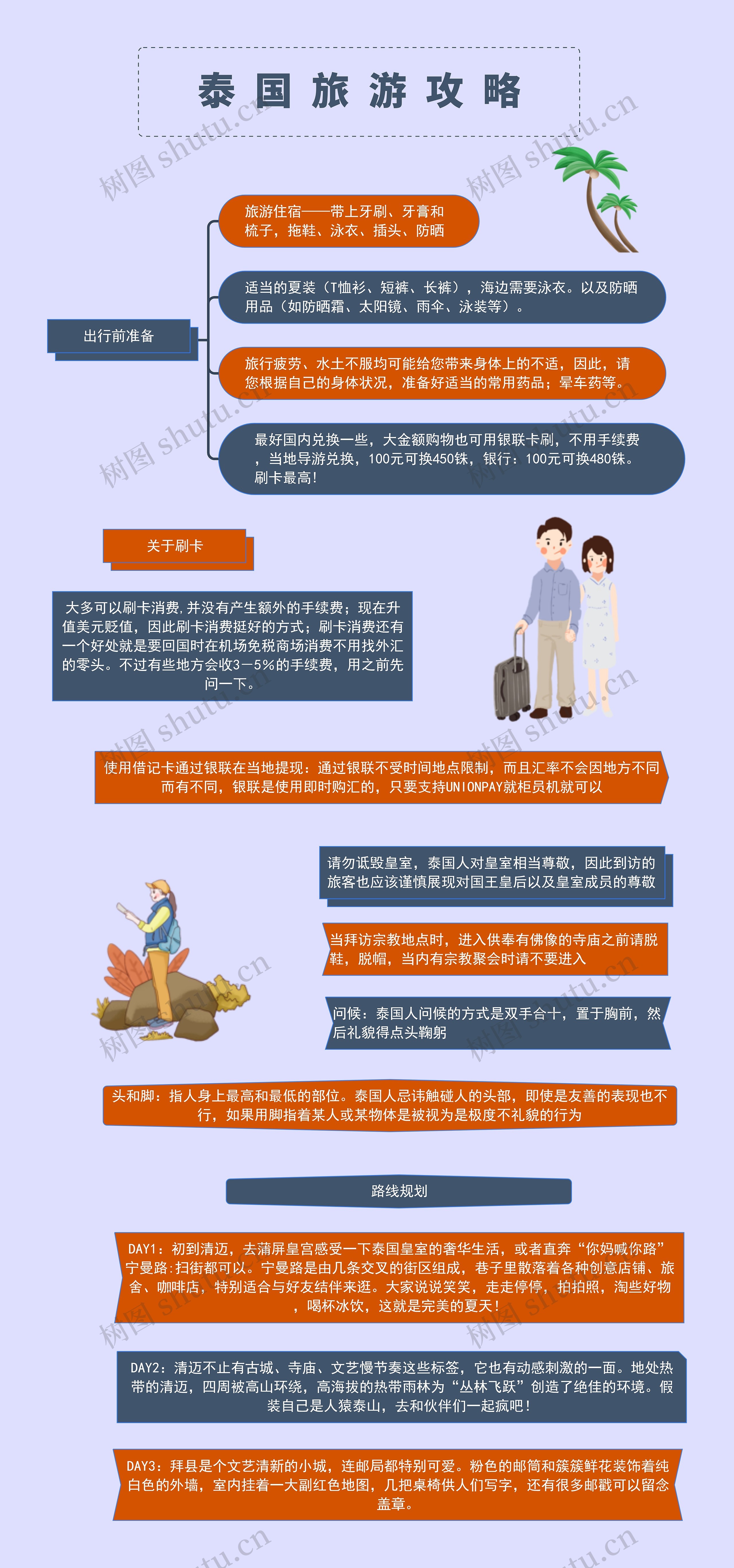 请勿诋毁皇室,泰国人对皇室相当尊敬,因此到访的旅客也应该谨慎展现对国王皇后以及皇室成员的尊敬思维导图模板大纲
