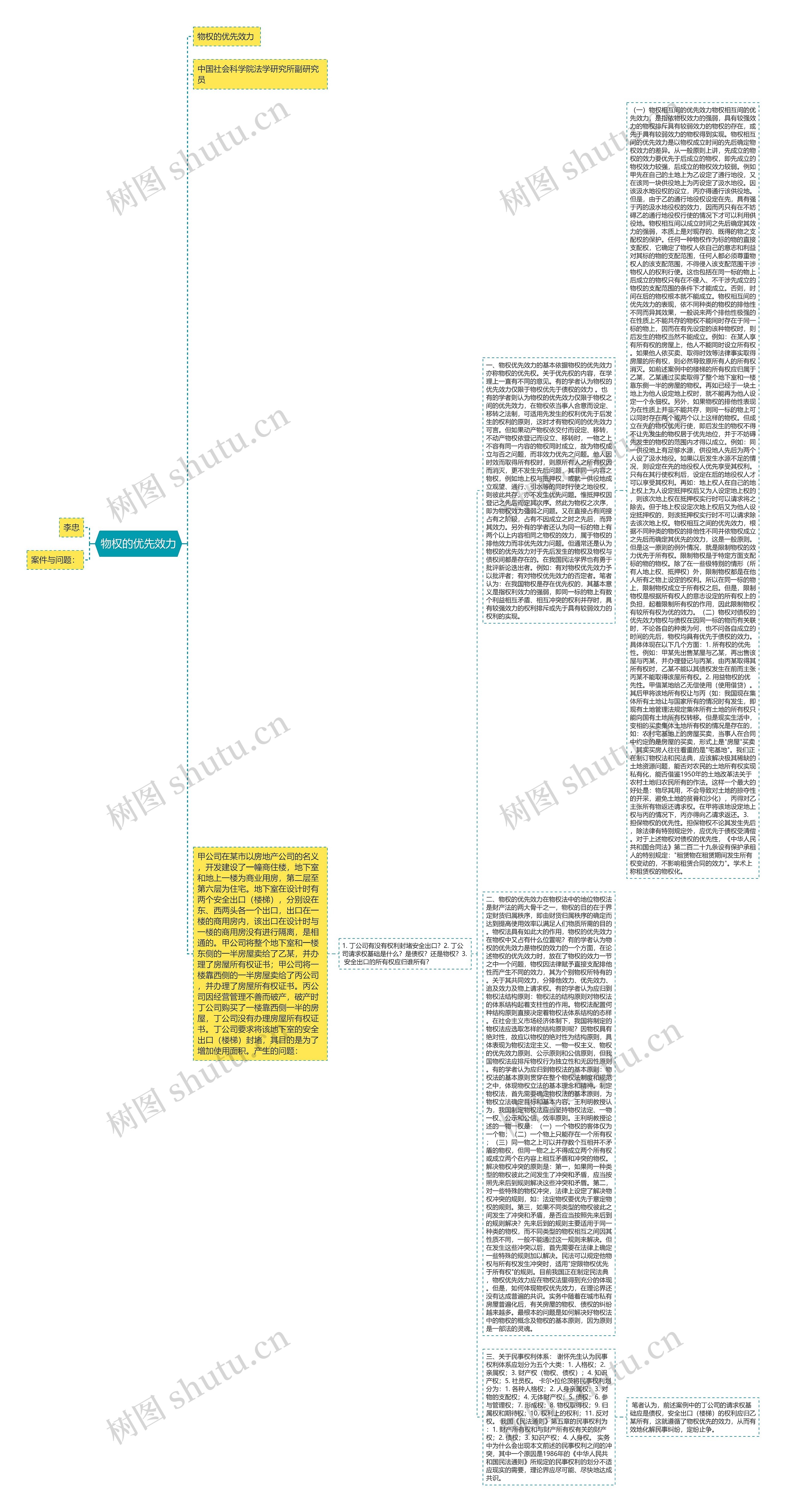 (一)物权相互间的优先效力物权相互间的优先效力,是指依物权效力的强弱,具有较强效力的物权排斥具有较弱效力的物权的存在,或先于具有较弱效力的物权得到实现。物权相互间的优先效力是以物权成立时间的先后确定物权效力的差异。从一般原则上讲,先成立的物权的效力要优先于后成立的物权,即先成立的物权效力较强,后成立的物权效力较弱。例如甲先在自己的土地上为乙设定了通行地役,又在该同一块供役地上为丙设定了汲水地役。因该汲水地役权的设立,丙亦得通行该供役地。但是,由于乙的通行地役权设定在先,具有强于丙的汲水地役权的效力,因而丙只有在不妨碍乙的通行地役权行使的情况下才可以利用供役地。物权相互间以成立时间之先后确定其效力的强弱,本质上是对现存的、既得的物之支配权的保护。任何一种物权作为标的物的直接支配权,它确定了物权人依自己的意志和利益对其标的物的支配范围,任何人都必须尊重物权人的该支配范围,不得侵入该支配范围干涉物权人的权利行使。这也包括在同一标的物上后成立的物权只有在不侵入、不干涉先成立的物权的支配范围的条件下才能成立。否则,时间在后的物权根本就不能成立。物权相互间的优先效力的表现,依不同种类的物权的排他性不同而异其效果,一般说来两个排他性极强的在性质上不能共存的物权不能同时存在于同一标的物上,因而在有先设定的该种物权时,则后发生的物权当然不能成立。例如:在某人享有所有权的房屋上,他人不能同时设立所有权。如果他人依买卖、取得时效等法律事实取得房屋的所有权,则必然导致原所有人的所有权消灭。如前述案例中的楼梯的所有权应归属于乙某,乙某通过买卖取得了整个地下室和一楼靠东侧一半的房屋的物权。再如已经于一块土地上为他人设定地上权时,就不能再为他人设定一个永佃权。另外,如果物权的排他性表现为在性质上并非不能共存,则同一标的物上可以同时存在两个或两个以上这样的物权。但成立在先的物权优先行使,即后发生的物权不得不让先发生的物权居于优先地位,并于不妨碍先发生的物权的范围内才得以成立。例如:同一供役地上有足够水源,供役地人先后为两个人设了汲水地役。如果以后发生水源不足的情况,则设定在先的地役权人优先享受其权利。只有在其行使权利后,设定在后的地役权人才可以享受其权利。再如:地上权人在自己的地上权上为人设定抵押权后又为人设定地上权的,则该次地上权在抵押权实行时可以请求将之除去。但于地上权设定次地上权后又为他人设定抵押权的,则该抵押权实行时不可以请求除去该次地上权。物权相互之间的优先效力,根据不同种类的物权的排他性不同并依物权成立之先后而确定其优先的效力,这是一般原则。但是这一原则的例外情况,就是限制物权的效力优先于所有权。限制物权是于特定方面支配标的物的物权。除了在一些极特别的情形(所有人地上权、抵押权)外,限制物权都是在他人所有之物上设定的权利。所以在同一标的物上,限制物权成立于所有权之后。但是,限制物权是根据所有权人的意志设定的所有权上的负担,起着限制所有权的作用,因此限制物权有较所有权为优的效力。(二)物权对债权的优先效力物权与债权在因同一标的物而有关联时,不论各自的种类为何,也不问各自成立的时间的先后,物权均具有优先于债权的效力。具体体现在以下几个方面:1. 所有权的优先性。例如:甲某先出售某屋与乙某,再出售该屋与丙某,并办理登记与丙某,由丙某取得其所有权时,乙某不能以其债权发生在前而主张丙某不能取得该屋所有权。2. 用益物权的优先性。甲借某地给乙无偿使用(使用借贷)。其后甲将该地所有权让与丙(如:我国现在集体所有土地让与国家所有的情况时有发生,即现有土地管理法规定集体所有土地的所有权只能向国有土地所有权转移。但是现实生活中,变相的买卖集体土地所有权的情况是存在的,如:农村宅基地上的房屋买卖,当事人在合同中约定的是房屋的买卖,形式上是"房屋"买卖,其实买房人往往看重的是"宅基地"。我们正在制订物权法和民法典,应该解决极其稀缺的土地资源问题,能否对农民的土地所有权实现私有化,能否借鉴1950年的土地改革法关于农村土地归农民所有的作法。这样一个最大的好处是:物尽其用,不会导致对土地的掠夺性的开采,避免土地的贫脊和沙化),丙得对乙主张所有物返还请求权。在甲将该地设定地上权与丙的情况下,丙亦得向乙请求返还。3. 担保物权的优先性。担保物权不论其发生先后,除法律有特别规定外,应优先于债权受清偿。对于上述物权对债权的优先性,《中华人民共和国合同法》第二百二十九条设有保护承租人的特别规定:"租赁物在租赁期间发生所有权变动的,不影响租赁合同的效力"。学术上称租赁权的物权化。