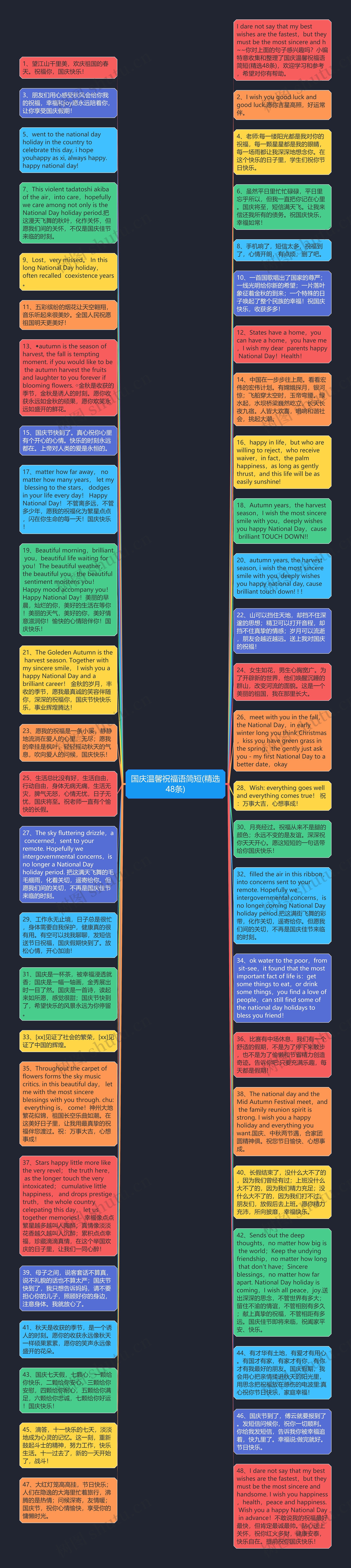 I dare not say that my best wishes are the fastest,but they must be the most sincere and h~~你对上面的句子感兴趣吗?小编特意收集和整理了国庆温馨祝福语简短(精选48条),欢迎学习和参考,希望对你有帮助。
