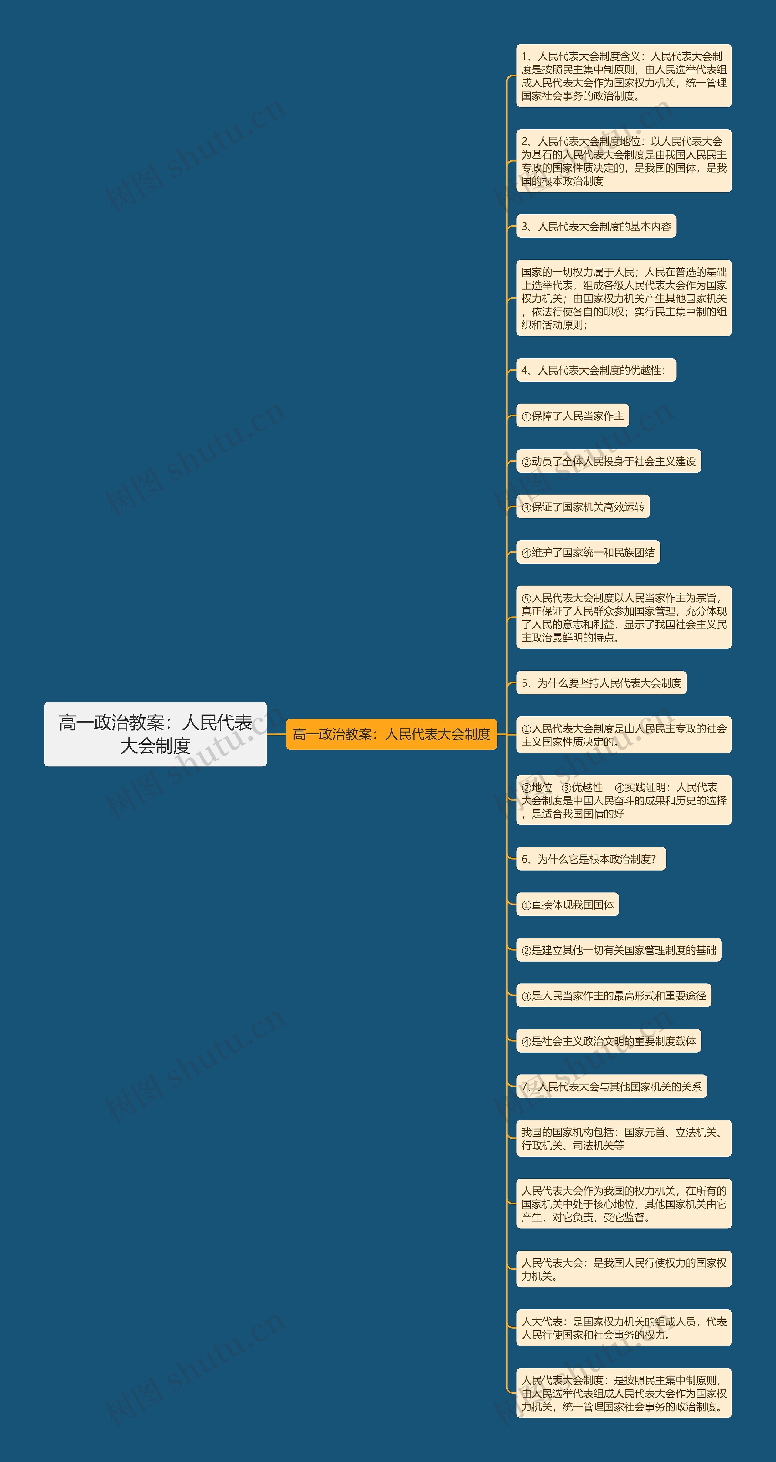 1、人民代表大会制度含义:人民代表大会制度是按照民主集中制原则,由人民选举代表组成人民代表大会作为国家权力机关,统一管理国家社会事务的政治制度。