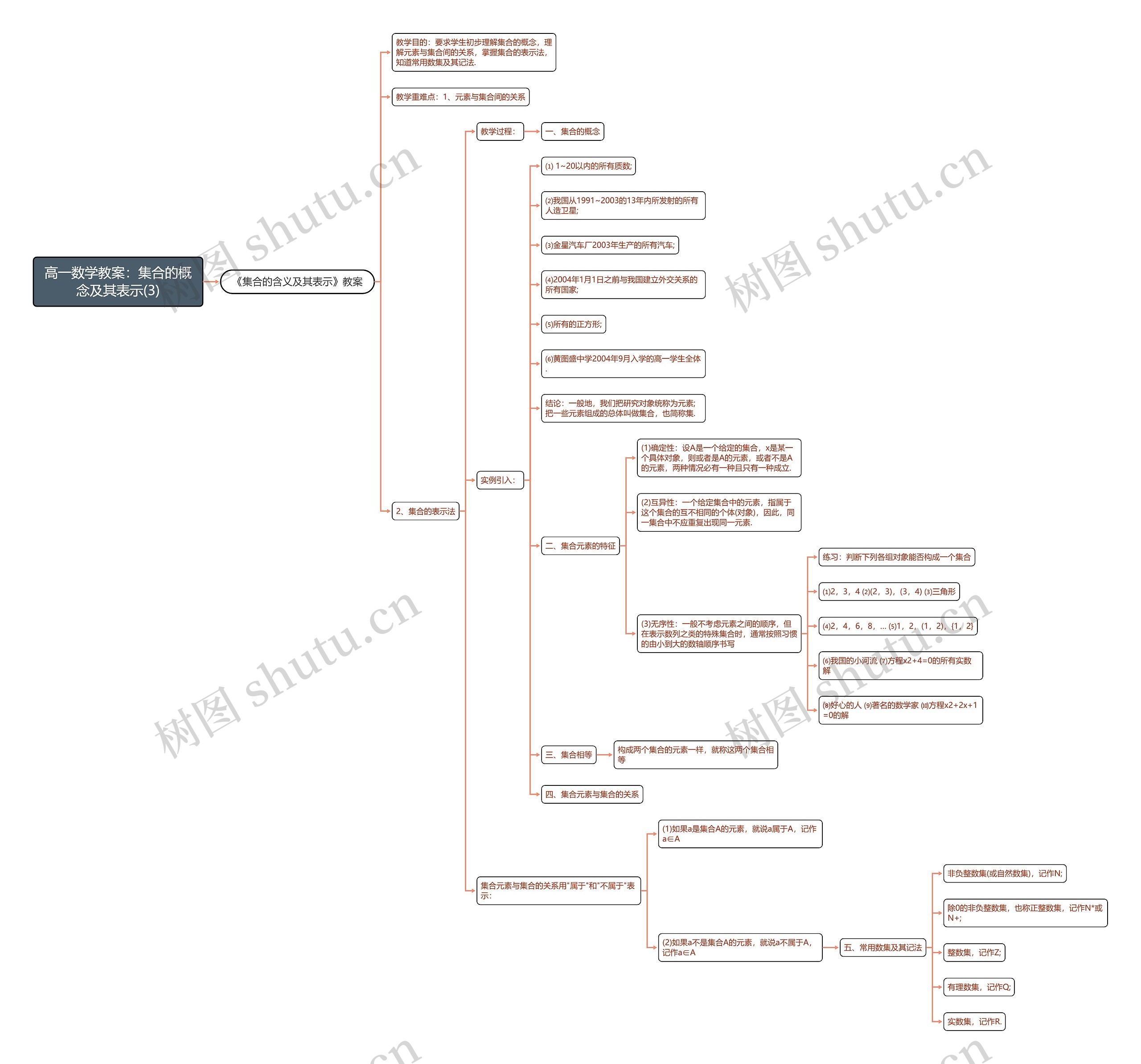 高一数学教案:集合的概念表示(3)思维导图包含以下知识点:集合的概念、元素与集合间的关系、集合的表示法、集合元素的特征和常用数集记法。在集合的概念部分,通过一些实例引入,让学生了解集合的含义,元素与集合间的关系中,学生需要理解元素属于一个集合或不属于一个集合,并用符号“∈”和“∉”表示。集合的表示法部分介绍了集合的名称和表示方式,在集合元素的特征中,学生需要了解确定性、互异性和无序性,教学中还介绍了常用数集记法,包含非负整数集、正整数集、整数集、有理数集和实数集,这些知识点将帮助学生初步理解集合的概念,并掌握集合的相关表示方法。