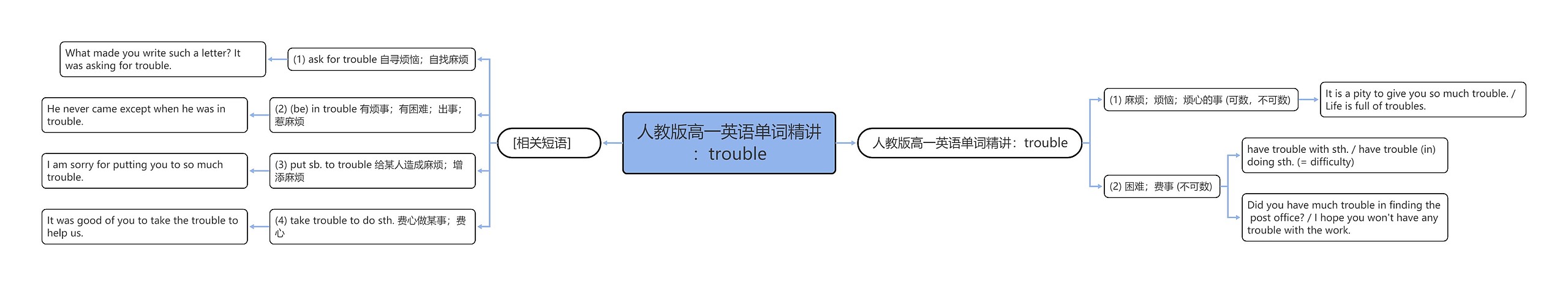 树图思维导图提供《人教版高一英语单词精讲:trouble》在线思维导图免费制作,点击“编辑”按钮,可对《人教版高一英语单词精讲:trouble》进行在线思维导图编辑,本思维导图属于思维导图模板主题,文件编号是:b272b3fafbe251fc6ab307b6aca7b5b0