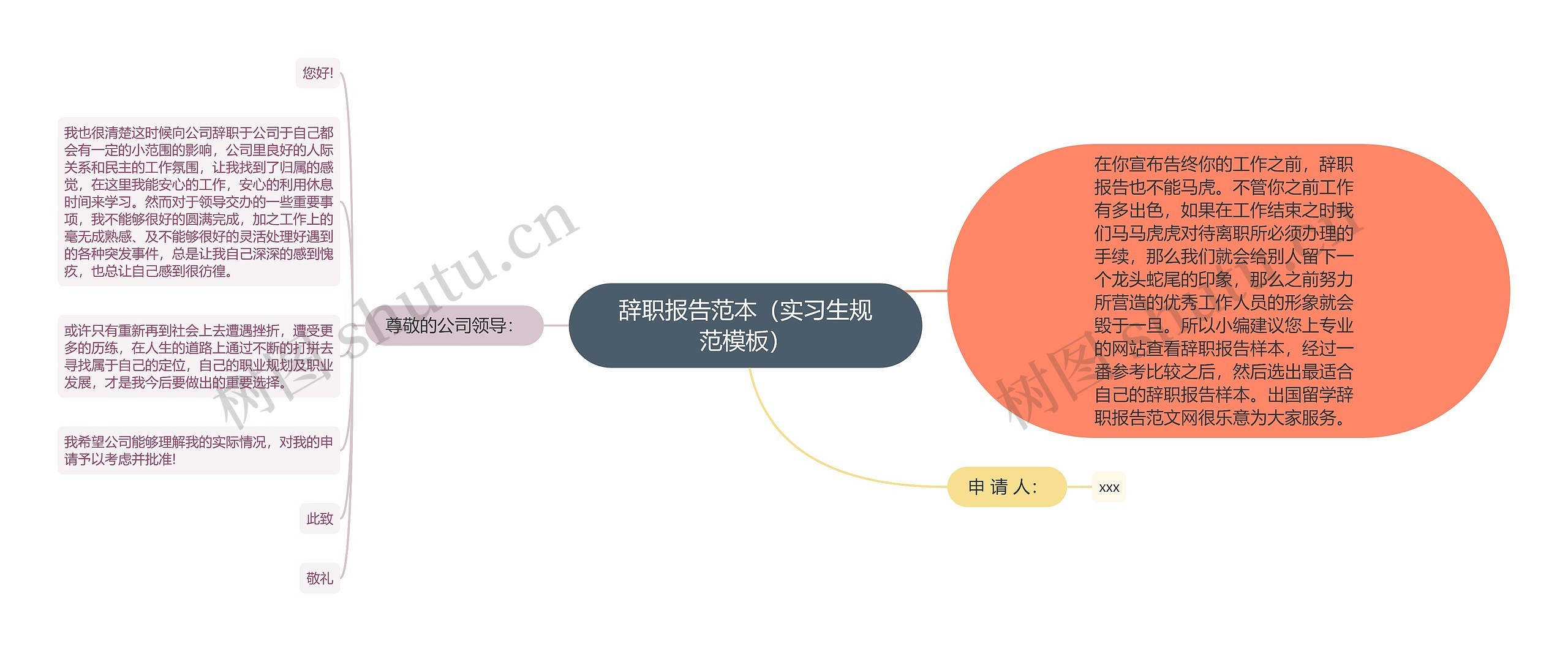 树图思维导图提供《辞职报告范本(实习生规范模板)》在线思维导图免费制作,点击“编辑”按钮,可对《辞职报告范本(实习生规范模板)》进行在线思维导图编辑,本思维导图属于思维导图模板主题,文件编号是:9ec9dc93dfbb4596084f04d7b444c9cf