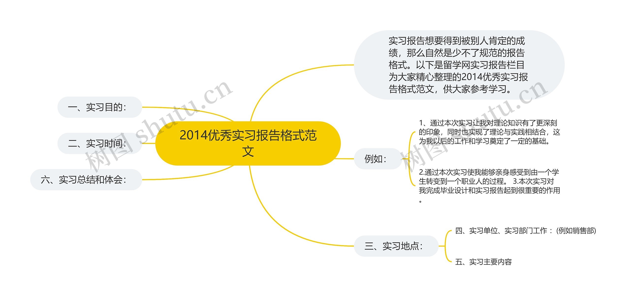 树图思维导图提供《2014优秀实习报告格式范文》在线思维导图免费制作,点击“编辑”按钮,可对《2014优秀实习报告格式范文》进行在线思维导图编辑,本思维导图属于思维导图模板主题,文件编号是:d9501835cf432fcb9f79299b3c4d35a6