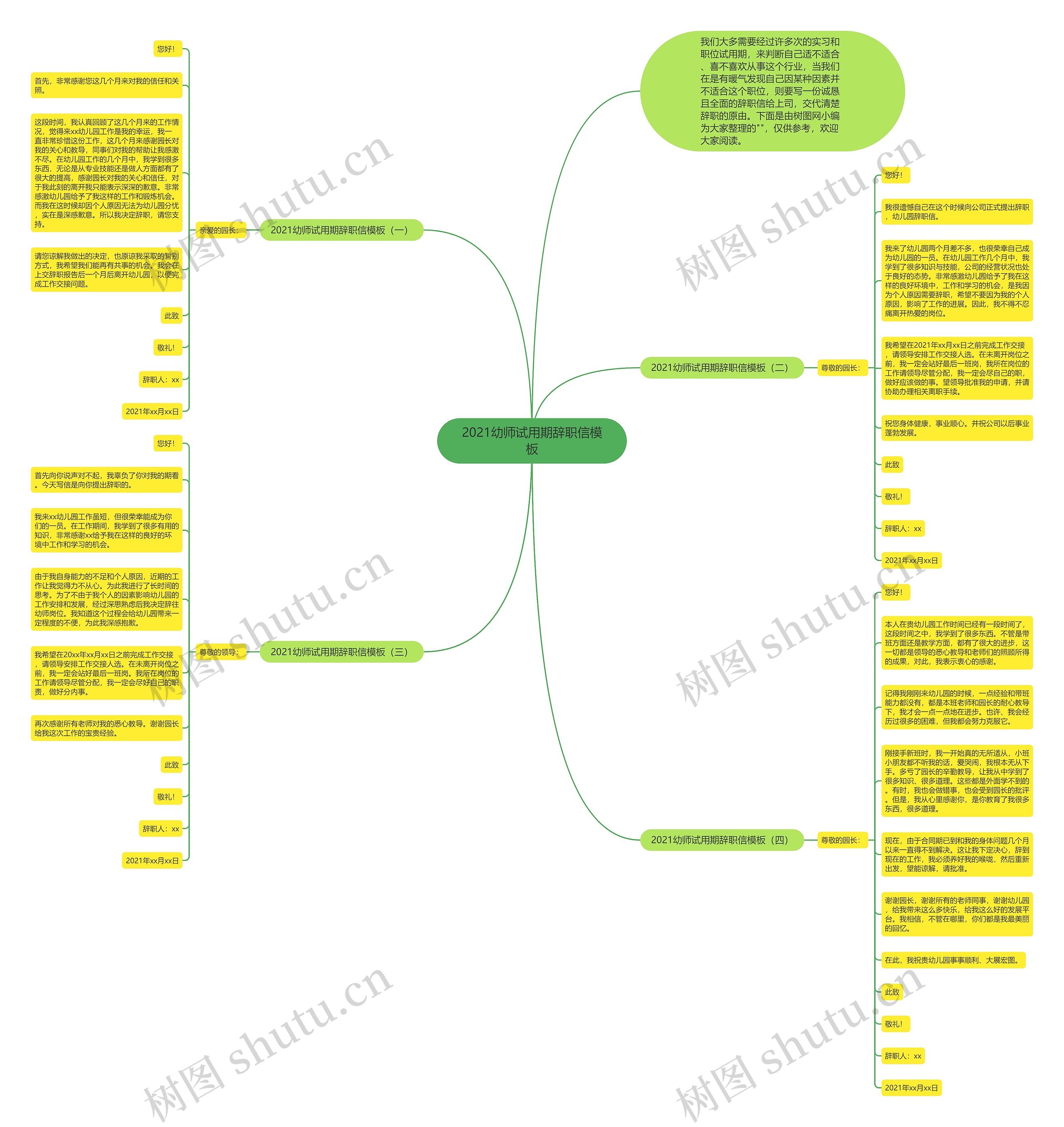 树图思维导图提供《2021幼师试用期辞职信模板》在线思维导图免费制作,点击“编辑”按钮,可对《2021幼师试用期辞职信模板》进行在线思维导图编辑,本思维导图属于思维导图模板主题,文件编号是:19204995d046085f16558a5042af59c5