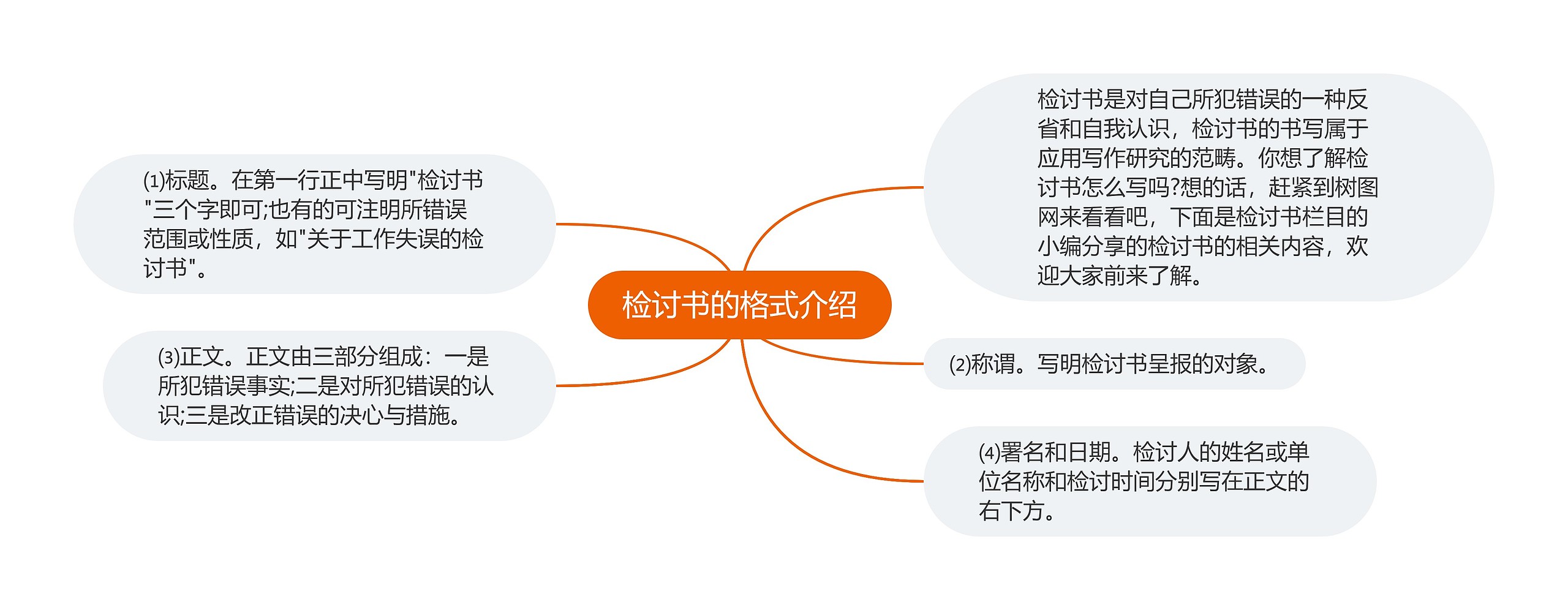 树图思维导图提供《检讨书的格式介绍》在线思维导图免费制作,点击“编辑”按钮,可对《检讨书的格式介绍》进行在线思维导图编辑,本思维导图属于思维导图模板主题,文件编号是:e01f592b18ba492abb2e03669efdf924