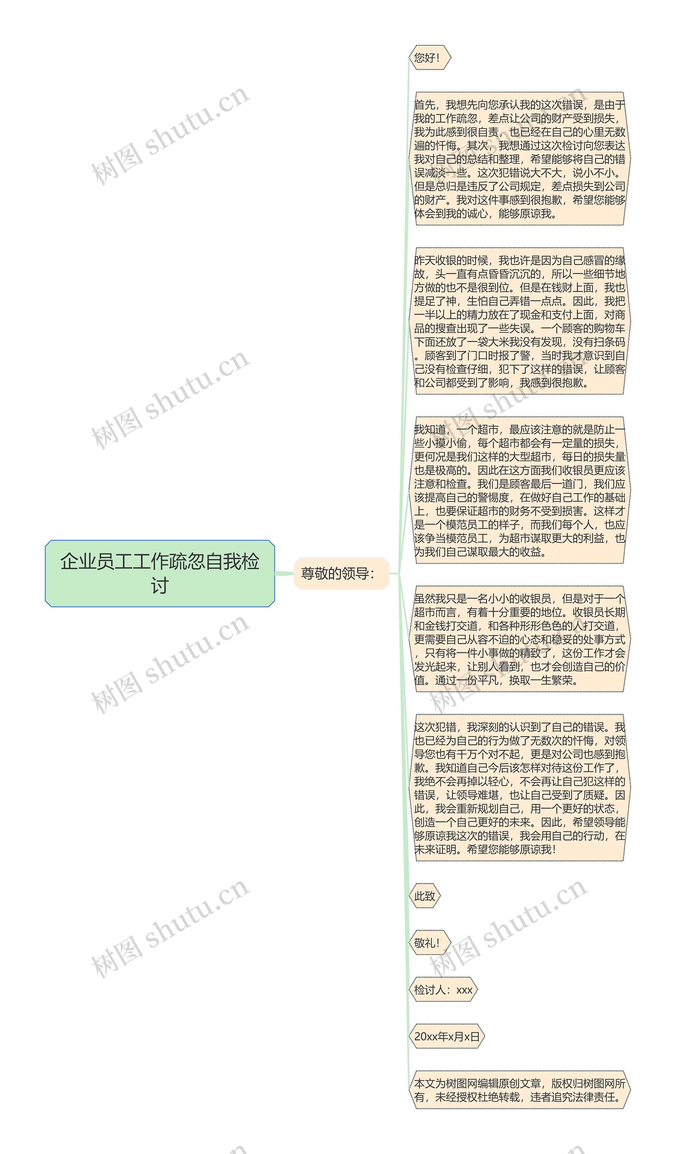 首先,我想先向您承认我的这次错误,是由于我的工作疏忽,差点让公司的财产受到损失,我为此感到很自责,也已经在自己的心里无数遍的忏悔。其次,我想通过这次检讨向您表达我对自己的总结和整理,希望能够将自己的错误减淡一些。这次犯错说大不大,说小不小。但是总归是违反了公司规定,差点损失到公司的财产。我对这件事感到很抱歉,希望您能够体会到我的诚心,能够原谅我。