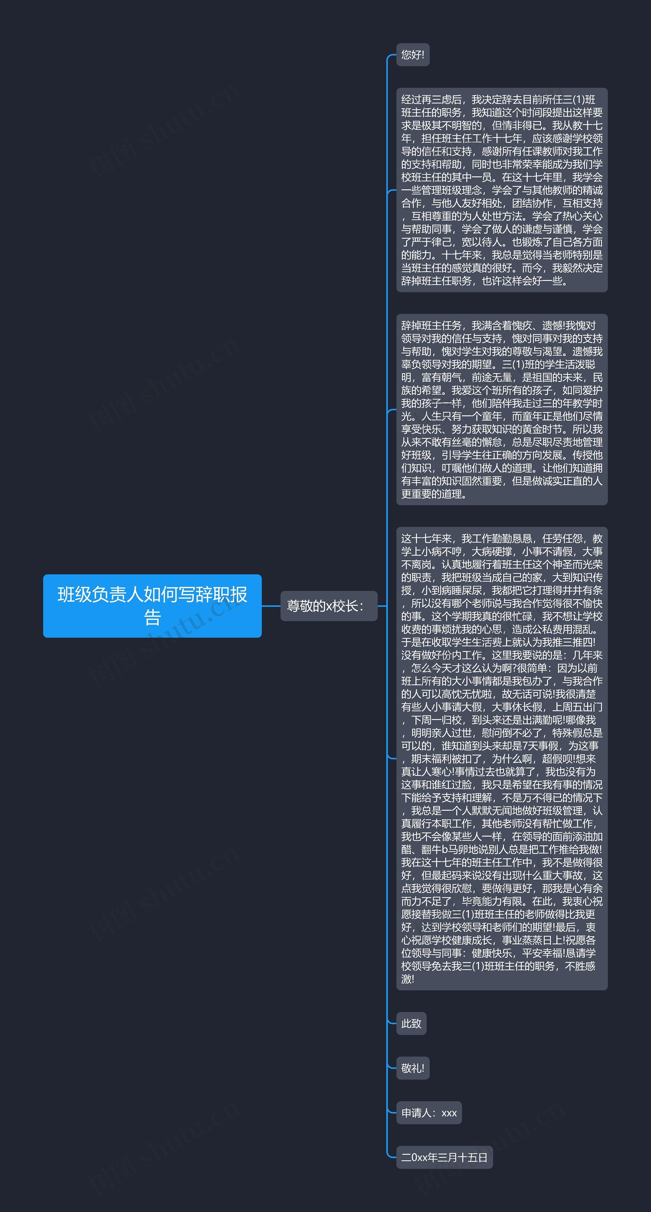 经过再三虑后,我决定辞去目前所任三(1)班班主任的职务,我知道这个时间段提出这样要求是极其不明智的,但情非得已。我从教十七年,担任班主任工作十七年,应该感谢学校领导的信任和支持,感谢所有任课教师对我工作的支持和帮助,同时也非常荣幸能成为我们学校班主任的其中一员。在这十七年里,我学会一些管理班级理念,学会了与其他教师的精诚合作,与他人友好相处,团结协作,互相支持,互相尊重的为人处世方法。学会了热心关心与帮助同事,学会了做人的谦虚与谨慎,学会了严于律己,宽以待人。也锻炼了自己各方面的能力。十七年来,我总是觉得当老师特别是当班主任的感觉真的很好。而今,我毅然决定辞掉班主任职务,也许这样会好一些。