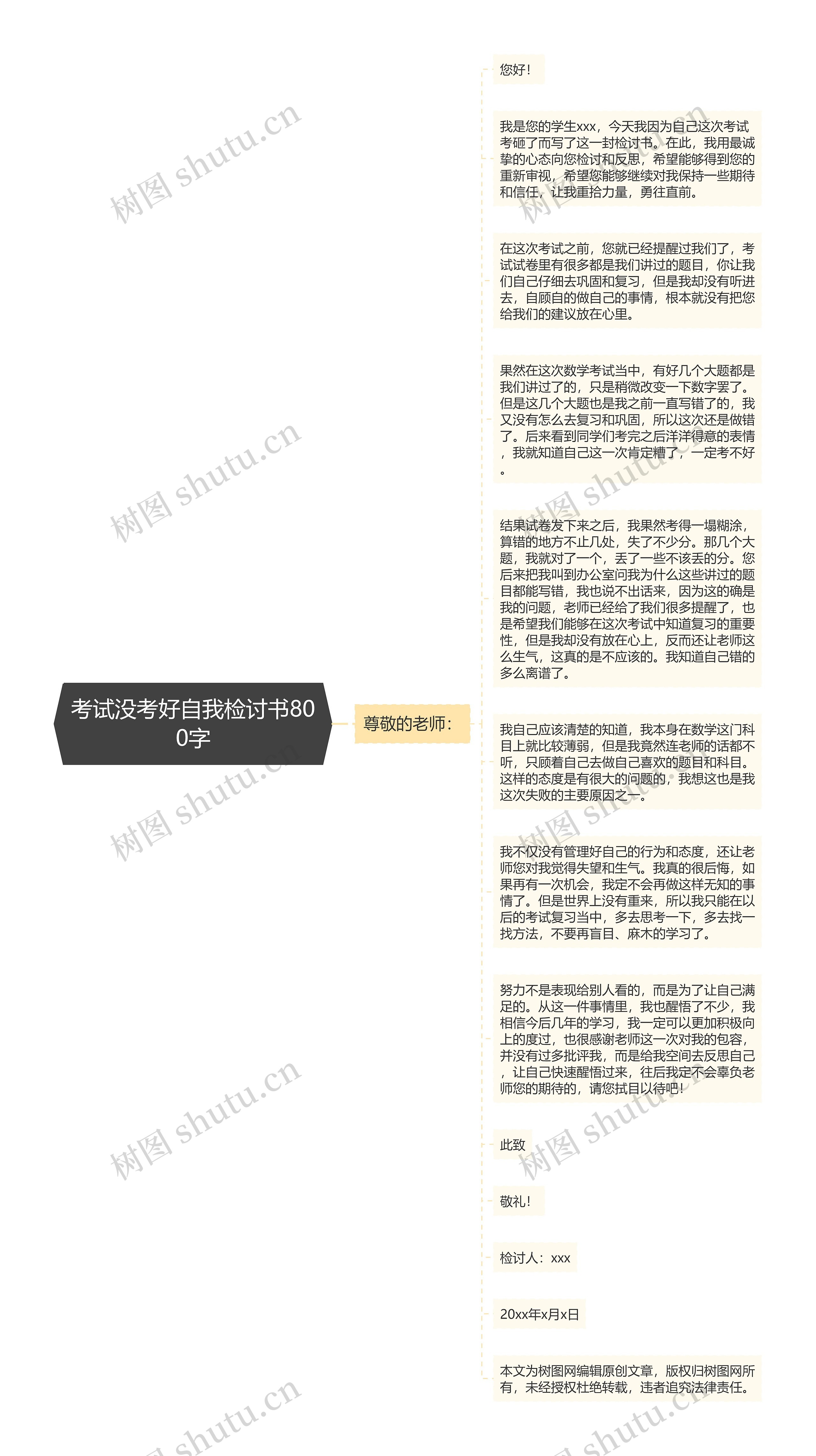 我是您的学生xxx,今天我因为自己这次考试考砸了而写了这一封检讨书。在此,我用最诚挚的心态向您检讨和反思,希望能够得到您的重新审视,希望您能够继续对我保持一些期待和信任,让我重拾力量,勇往直前。
