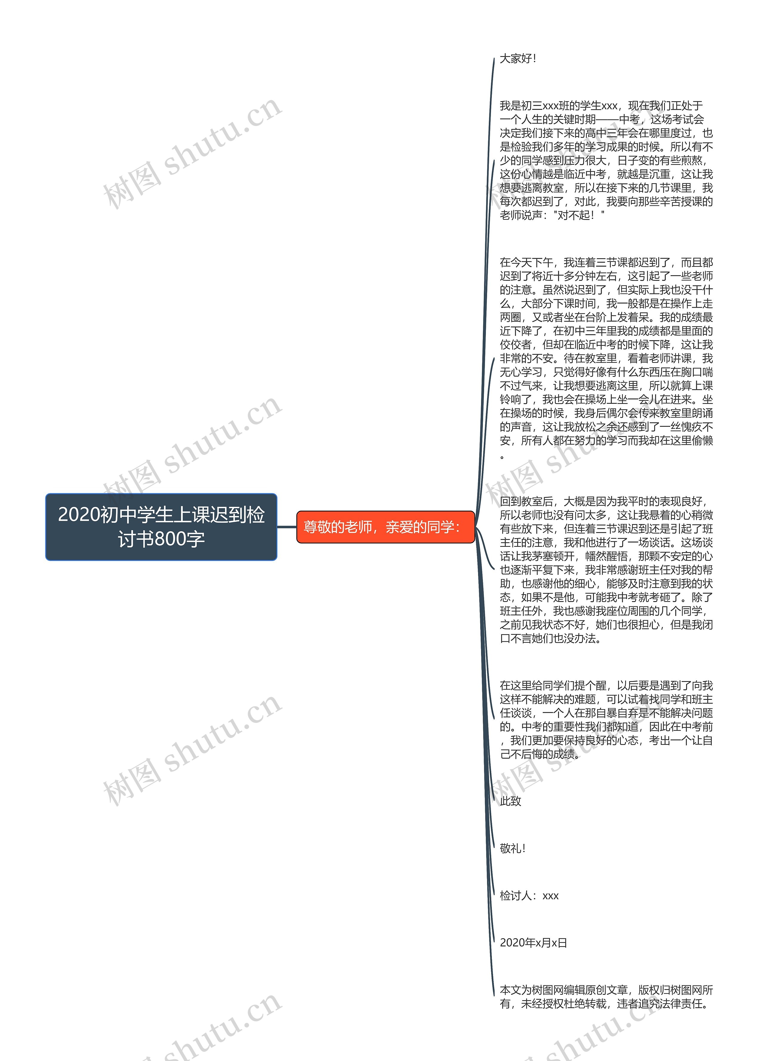 我是初三xxx班的学生xxx,现在我们正处于一个人生的关键时期——中考,这场考试会决定我们接下来的高中三年会在哪里度过,也是检验我们多年的学习成果的时候。所以有不少的同学感到压力很大,日子变的有些煎熬,这份心情越是临近中考,就越是沉重,这让我想要逃离教室,所以在接下来的几节课里,我每次都迟到了,对此,我要向那些辛苦授课的老师说声:"对不起!"