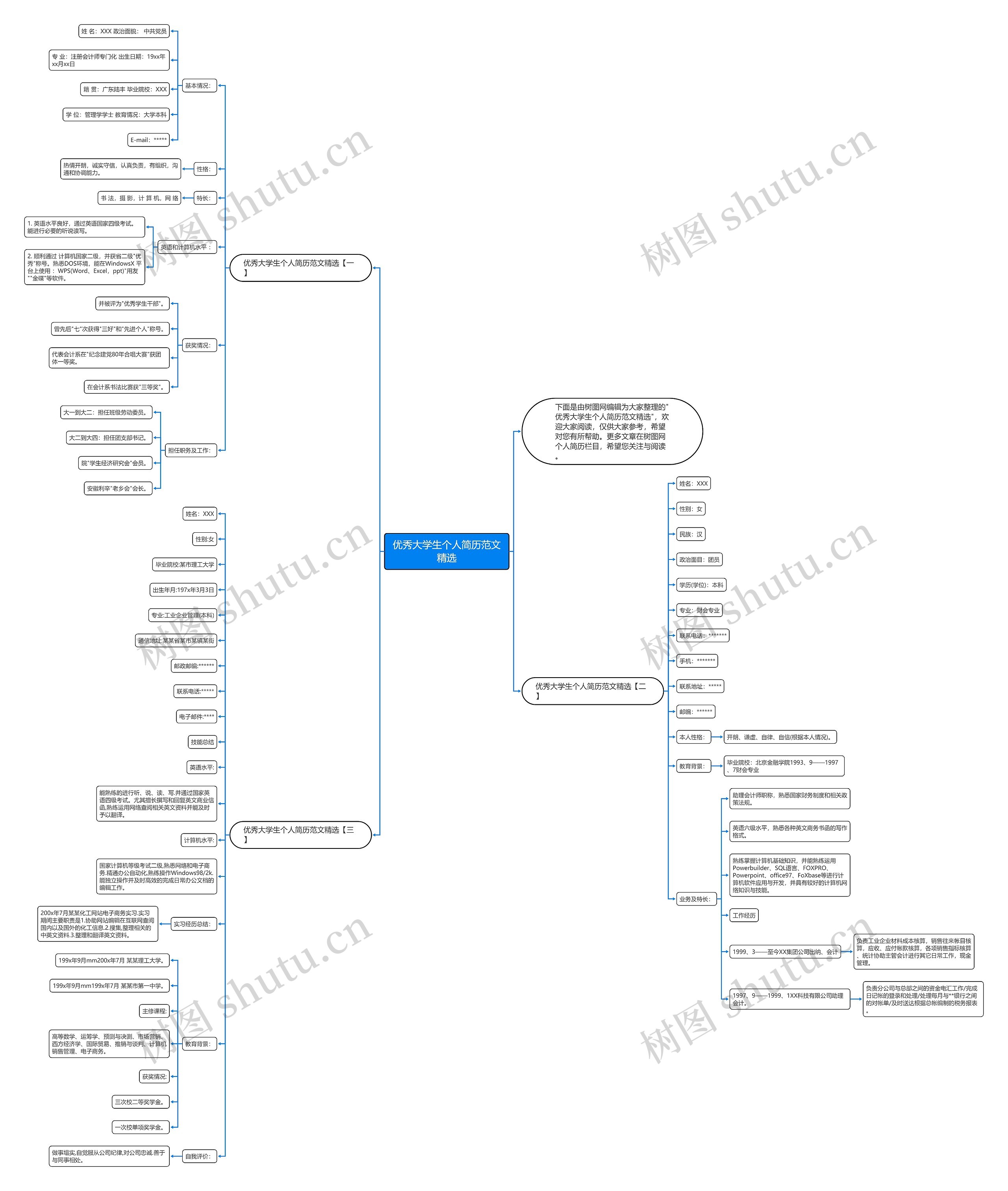 树图思维导图提供《优秀大学生个人简历范文精选》在线思维导图免费制作,点击“编辑”按钮,可对《优秀大学生个人简历范文精选》进行在线思维导图编辑,本思维导图属于思维导图模板主题,文件编号是:1e3eac55769187343766e96f1c0806d8