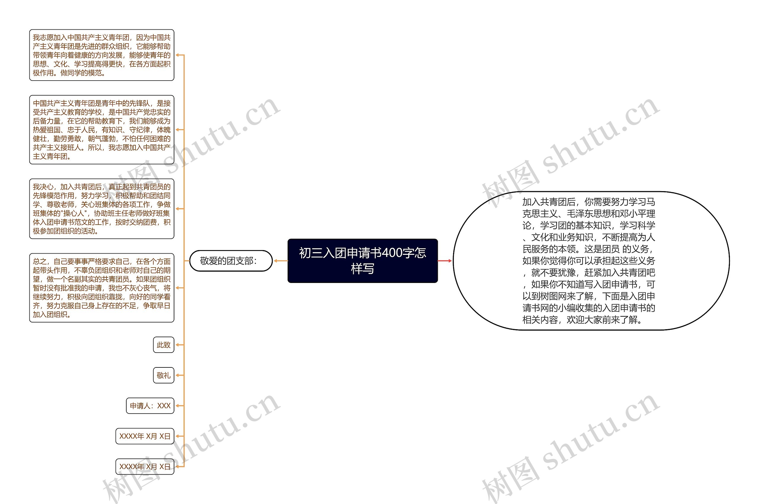 树图思维导图提供《初三入团申请书400字怎样写》在线思维导图免费制作,点击“编辑”按钮,可对《初三入团申请书400字怎样写》进行在线思维导图编辑,本思维导图属于思维导图模板主题,文件编号是:470cf5e4401264356040fb46f008c864