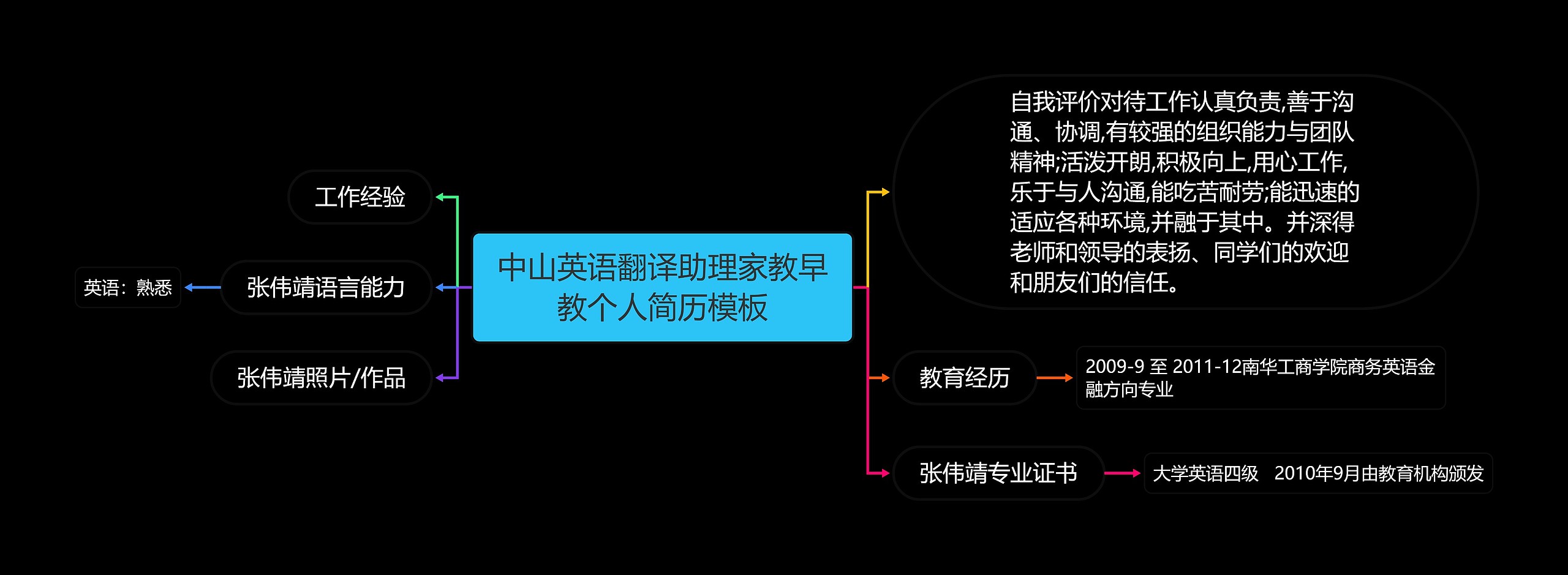 树图思维导图提供《中山英语翻译助理家教早教个人简历模板》在线思维导图免费制作,点击“编辑”按钮,可对《中山英语翻译助理家教早教个人简历模板》进行在线思维导图编辑,本思维导图属于思维导图模板主题,文件编号是:6f0590f8cd59d4afb5b2a7bd54030569