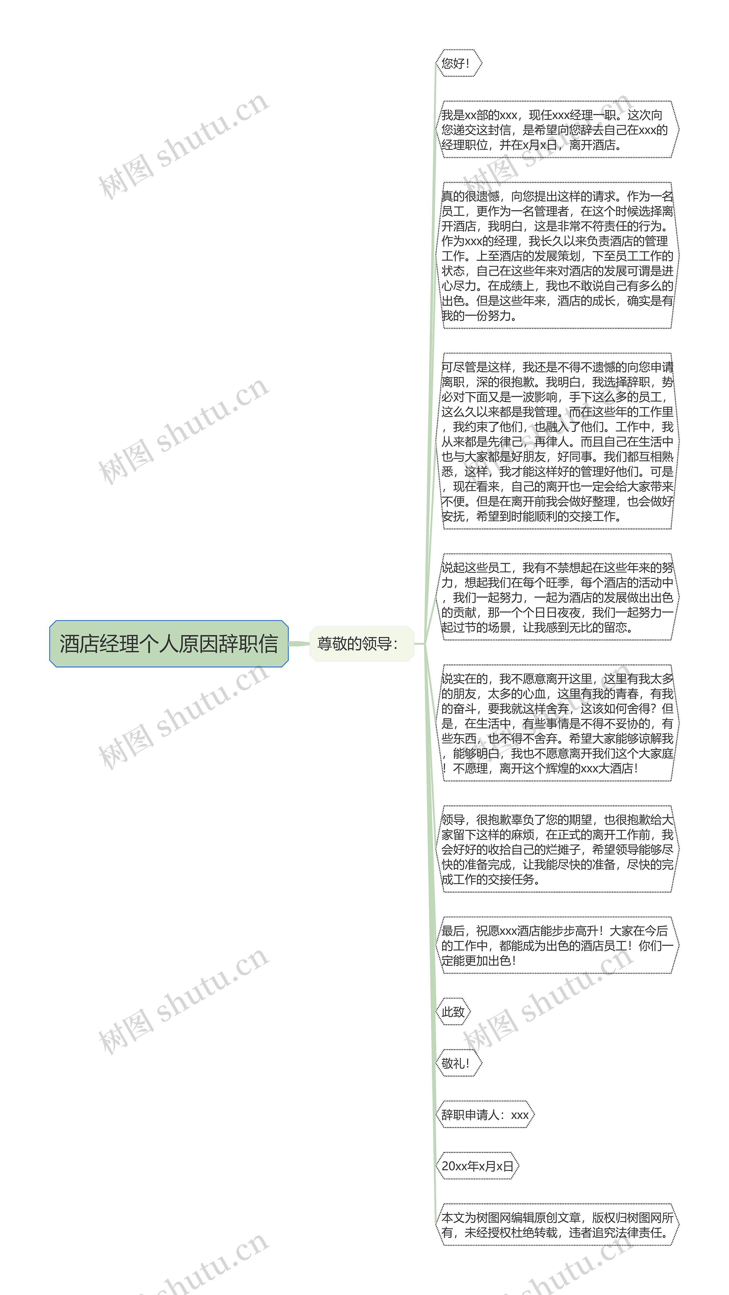 我是xx部的xxx,现任xxx经理一职。这次向您递交这封信,是希望向您辞去自己在xxx的经理职位,并在x月x日,离开酒店。