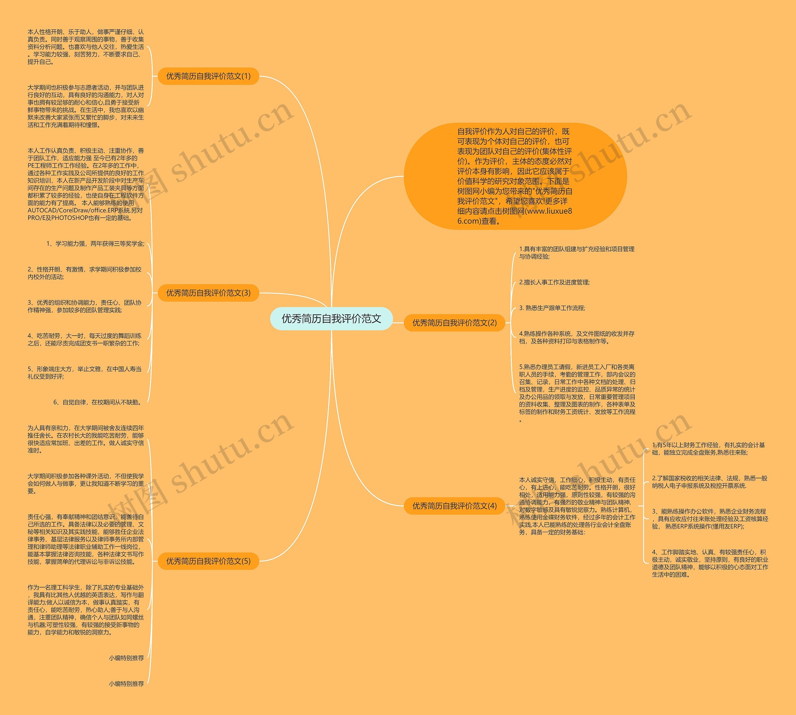 树图思维导图提供《优秀简历自我评价范文》在线思维导图免费制作,点击“编辑”按钮,可对《优秀简历自我评价范文》进行在线思维导图编辑,本思维导图属于思维导图模板主题,文件编号是:0239a06d7c6e09c346a3e27940f9c123