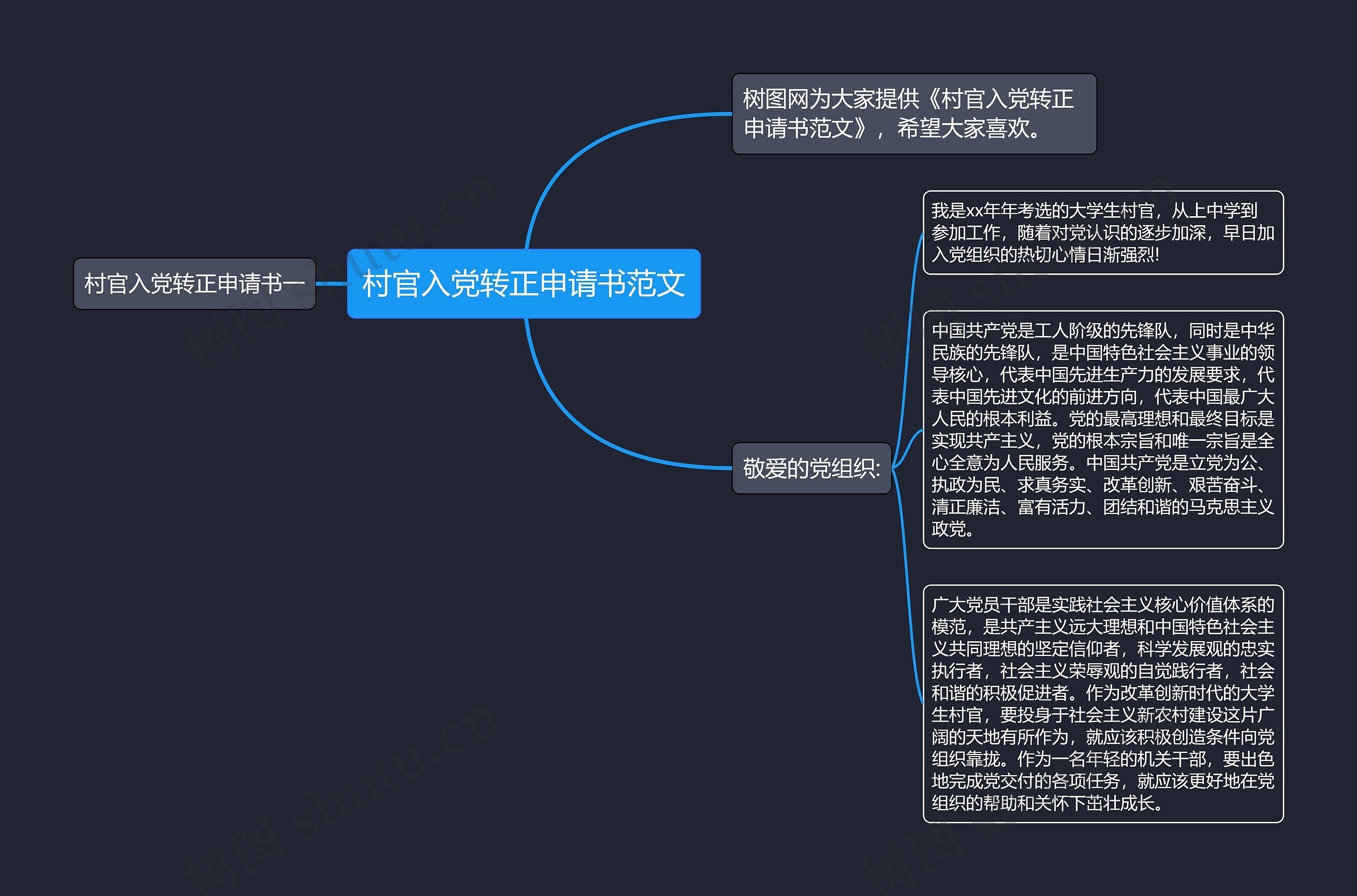 树图思维导图提供《村官入党转正申请书范文》在线思维导图免费制作,点击“编辑”按钮,可对《村官入党转正申请书范文》进行在线思维导图编辑,本思维导图属于思维导图模板主题,文件编号是:c3f8c9c2978c080432e8788a711881d5