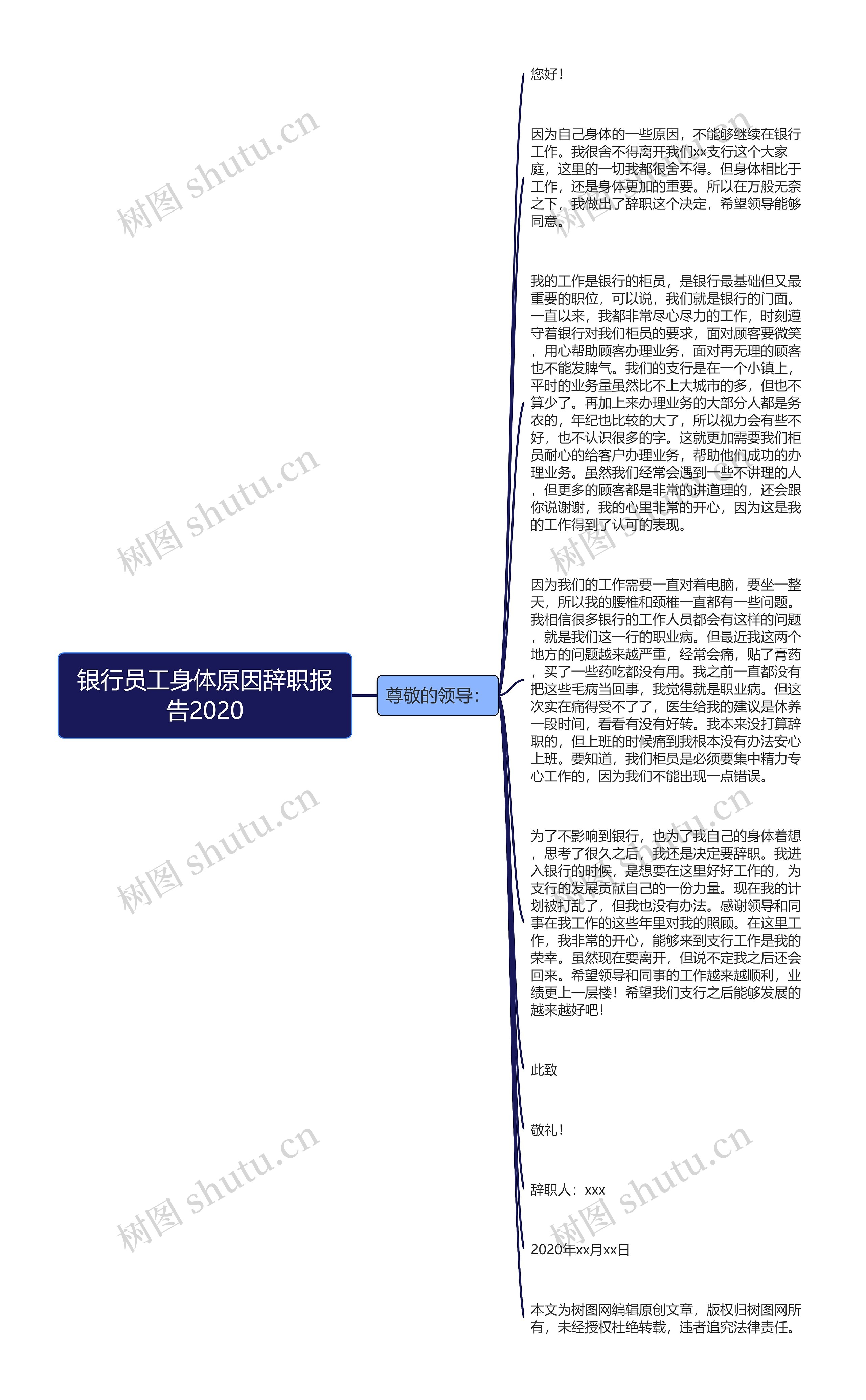 因为自己身体的一些原因,不能够继续在银行工作。我很舍不得离开我们xx支行这个大家庭,这里的一切我都很舍不得。但身体相比于工作,还是身体更加的重要。所以在万般无奈之下,我做出了辞职这个决定,希望领导能够同意。