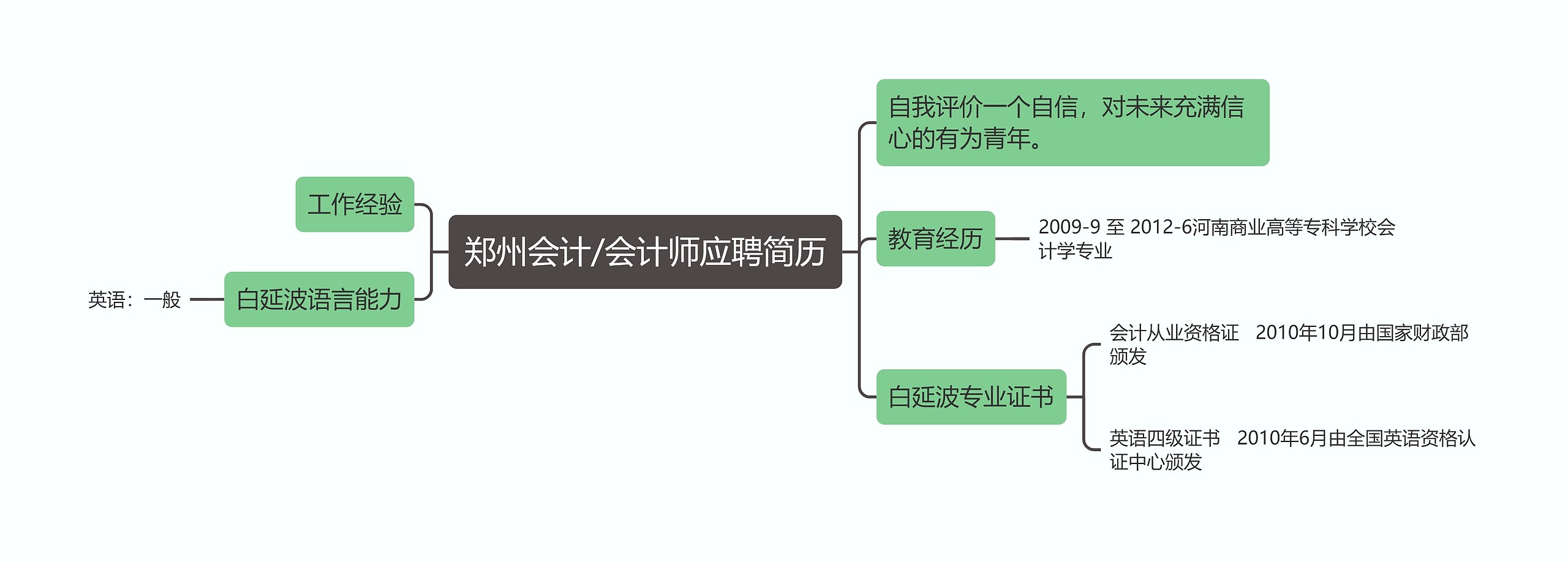 树图思维导图提供《郑州会计/会计师应聘简历》在线思维导图免费制作,点击“编辑”按钮,可对《郑州会计/会计师应聘简历》进行在线思维导图编辑,本思维导图属于思维导图模板主题,文件编号是:8e474b8a50ff53edce1aaad2be7b5e7d