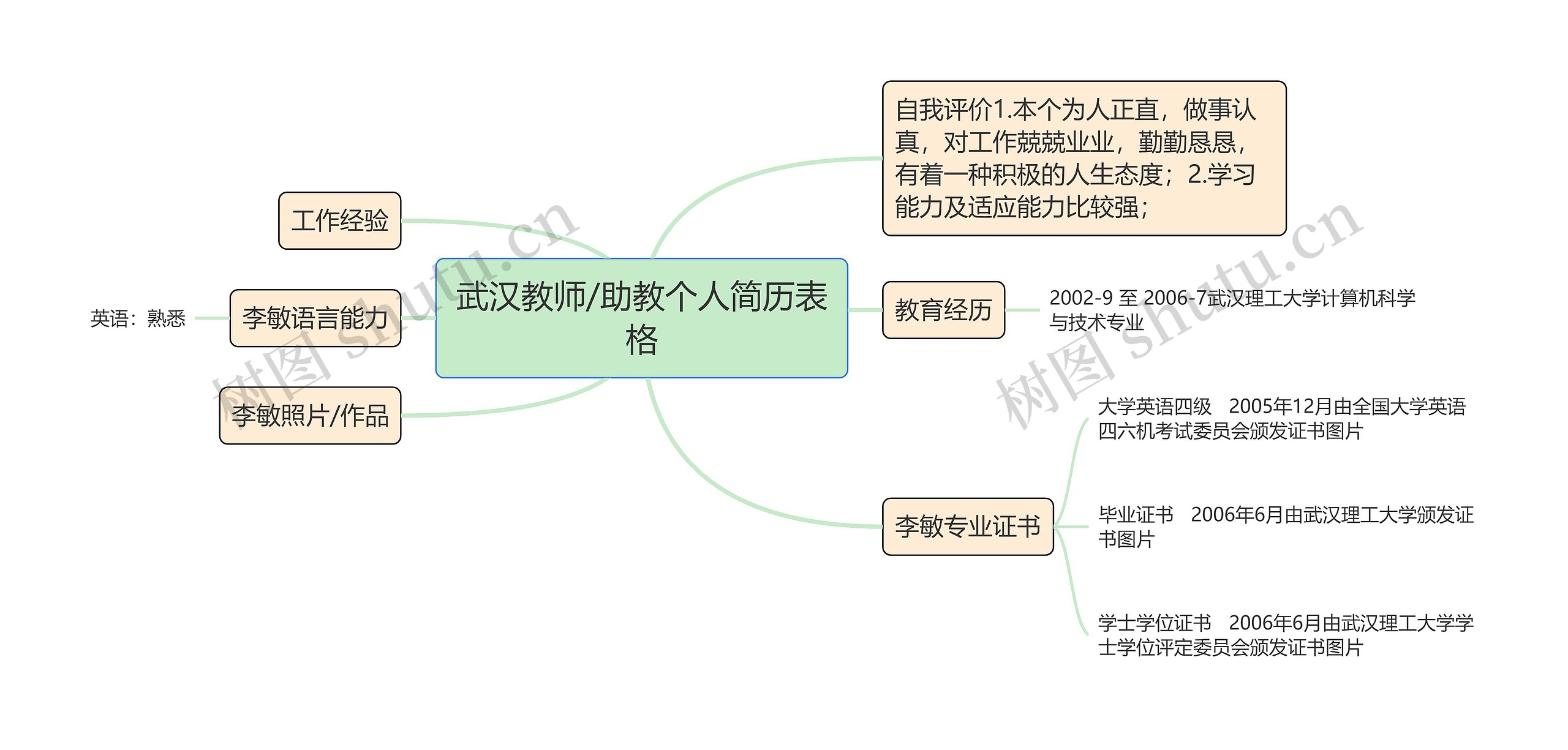 树图思维导图提供《武汉教师/助教个人简历表格》在线思维导图免费制作,点击“编辑”按钮,可对《武汉教师/助教个人简历表格》进行在线思维导图编辑,本思维导图属于思维导图模板主题,文件编号是:a289dabeba7f6d8da9a430d1e91afac1