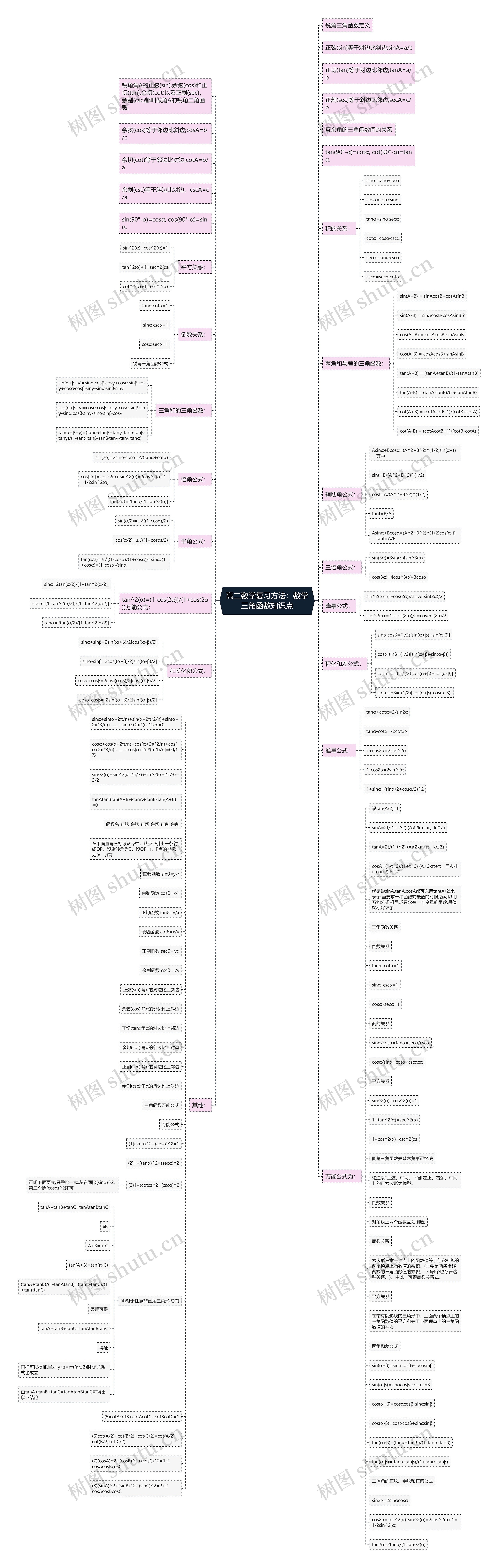 高二数学复习方法:数学三角函数知识点思维导图,在高二数学复习过程中,数学三角函数是一个重要的内容。在这个知识点中,需要掌握锐角三角函数的定义,如正弦、余弦、正切、余切、正割和余割的含义与计算方法,我们还需要了解互余角的三角函数之间的关系,和平方关系、积的关系、倒数关系。