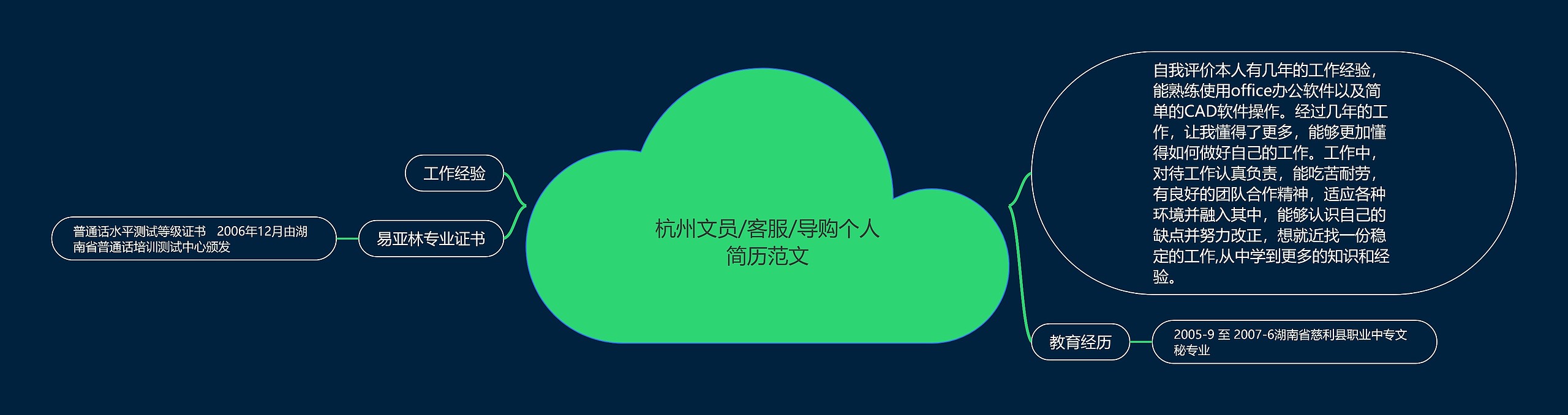 树图思维导图提供《杭州文员/客服/导购个人简历范文》在线思维导图免费制作,点击“编辑”按钮,可对《杭州文员/客服/导购个人简历范文》进行在线思维导图编辑,本思维导图属于思维导图模板主题,文件编号是:f26ae7b8b1036f25ea255ae5bb9f7082