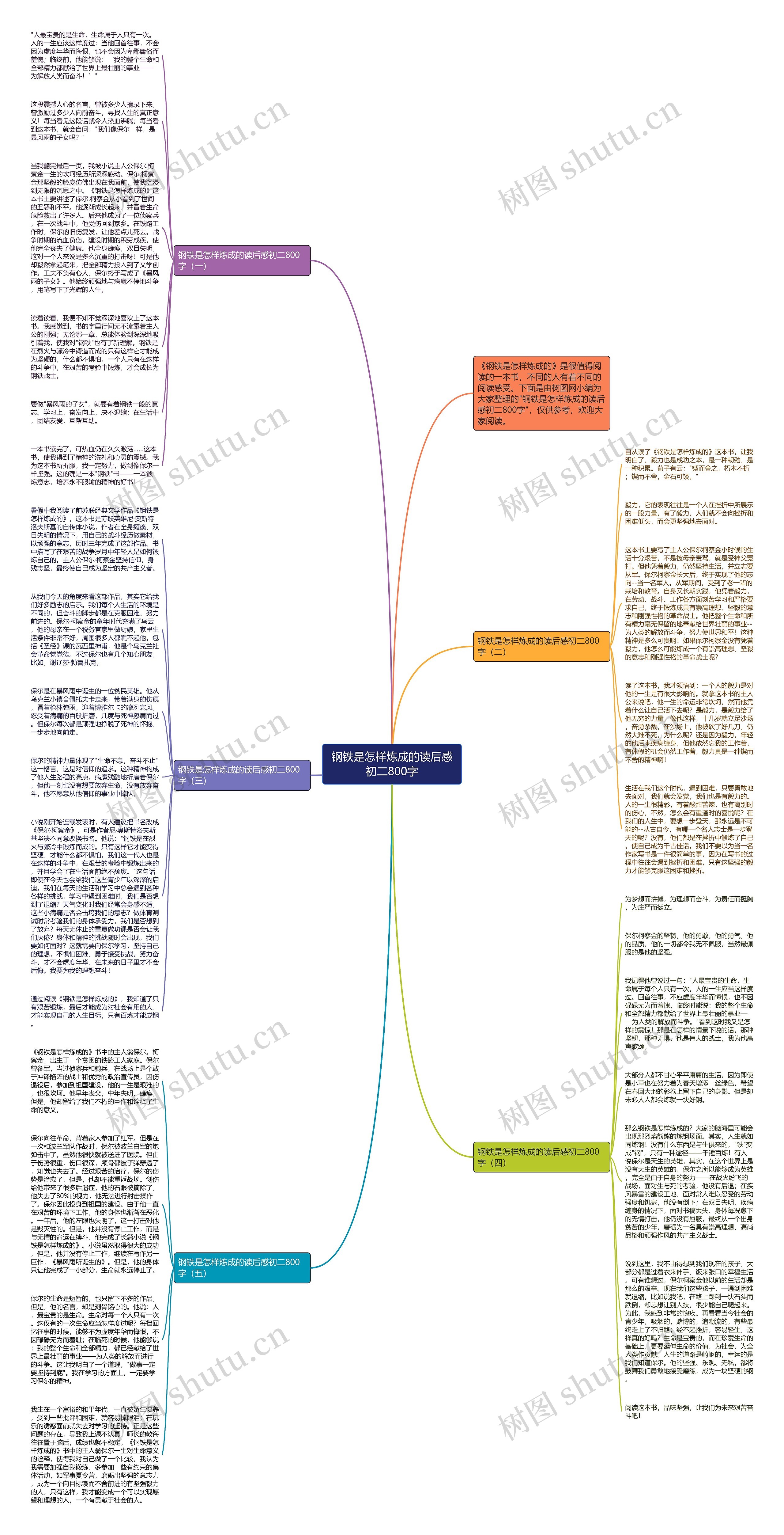 小说刚开始连载发表时,有人建议把书名改成《保尔·柯察金》,可是作者尼·奥斯特洛夫斯基坚决不同意改换书名。他说:"钢铁是在烈火与骤冷中锻炼而成的。只有这样它才能变得坚硬,才能什么都不惧怕。我们这一代人也是在这样的斗争中,在艰苦的考验中锻炼出来的,并且学会了在生活面前绝不颓废。"这句话即使在今天也会给我们这些青少年以深深的启迪。我们在每天的生活和学习中总会遇到各种各样的挑战,学习中遇到困难时,我们是否想到了退缩?天气变化时我们经常会身感不适,这些小病痛是否会击垮我们的意志?做体育测试时常考验我们的身体承受力,我们是否想到了放弃?每天无休止的重复做功课是否会让我们厌倦?身体和精神的挑战随时会出现,我们要如何面对?这就需要向保尔学习,坚持自己的理想,不惧怕困难,勇于接受挑战,努力奋斗,才不会虚度年华,在未来的日子里才不会后悔。我要为我的理想奋斗!