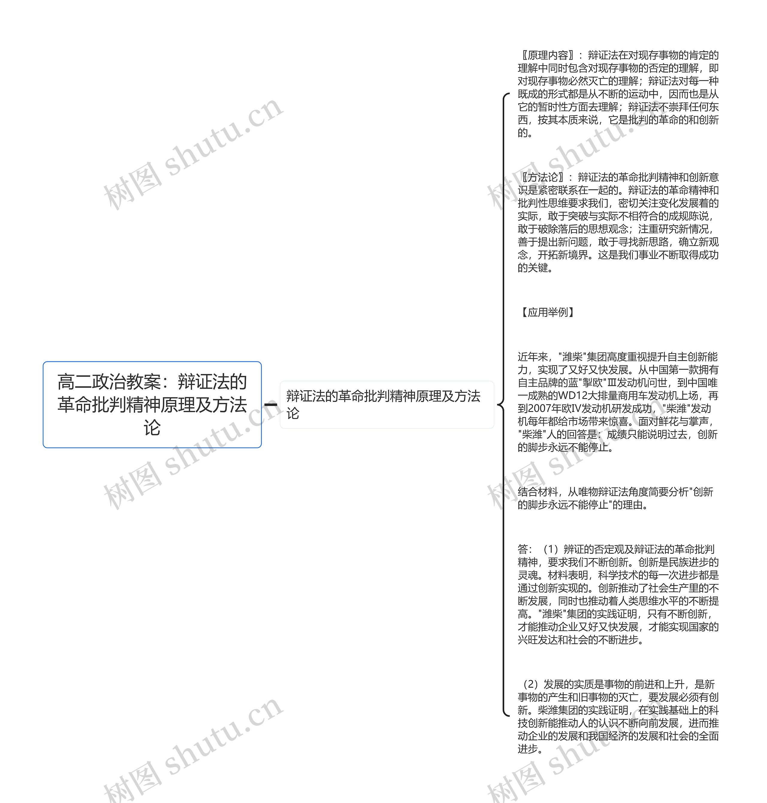 〖原理内容〗:辩证法在对现存事物的肯定的理解中同时包含对现存事物的否定的理解,即对现存事物必然灭亡的理解;辩证法对每一种既成的形式都是从不断的运动中,因而也是从它的暂时性方面去理解;辩证法不崇拜任何东西,按其本质来说,它是批判的革命的和创新的。