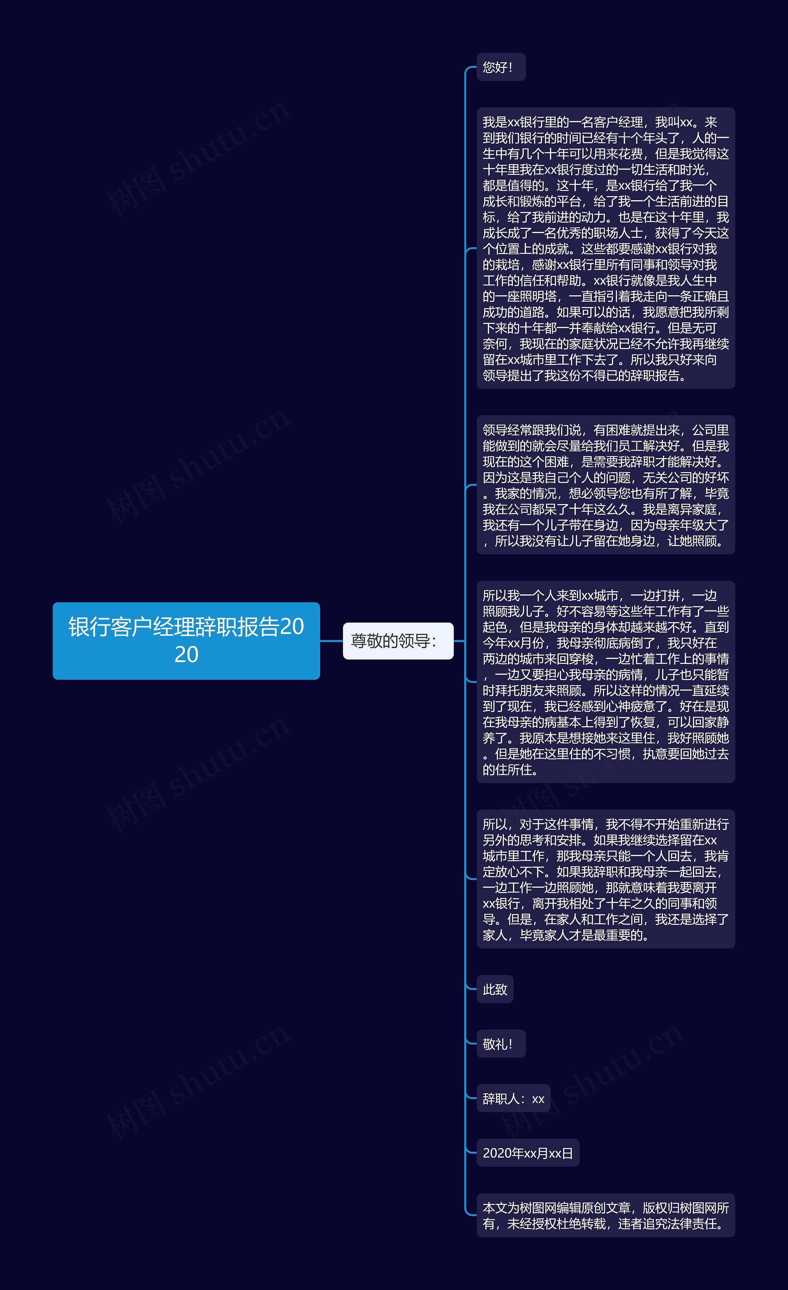 我是xx银行里的一名客户经理,我叫xx。来到我们银行的时间已经有十个年头了,人的一生中有几个十年可以用来花费,但是我觉得这十年里我在xx银行度过的一切生活和时光,都是值得的。这十年,是xx银行给了我一个成长和锻炼的平台,给了我一个生活前进的目标,给了我前进的动力。也是在这十年里,我成长成了一名优秀的职场人士,获得了今天这个位置上的成就。这些都要感谢xx银行对我的栽培,感谢xx银行里所有同事和领导对我工作的信任和帮助。xx银行就像是我人生中的一座照明塔,一直指引着我走向一条正确且成功的道路。如果可以的话,我愿意把我所剩下来的十年都一并奉献给xx银行。但是无可奈何,我现在的家庭状况已经不允许我再继续留在xx城市里工作下去了。所以我只好来向领导提出了我这份不得已的辞职报告。