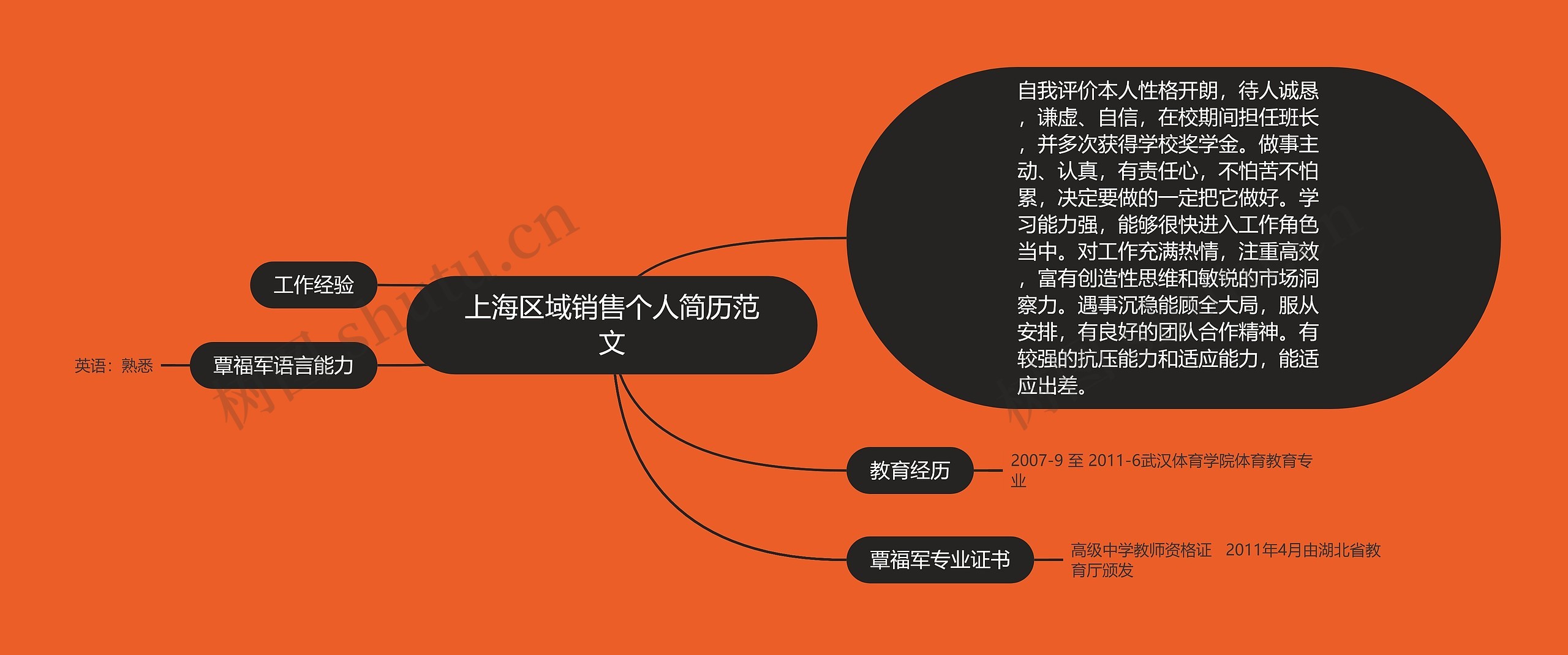 树图思维导图提供《上海区域销售个人简历范文》在线思维导图免费制作,点击“编辑”按钮,可对《上海区域销售个人简历范文》进行在线思维导图编辑,本思维导图属于思维导图模板主题,文件编号是:57540f640aa5b710dbcd70f1cb201c22