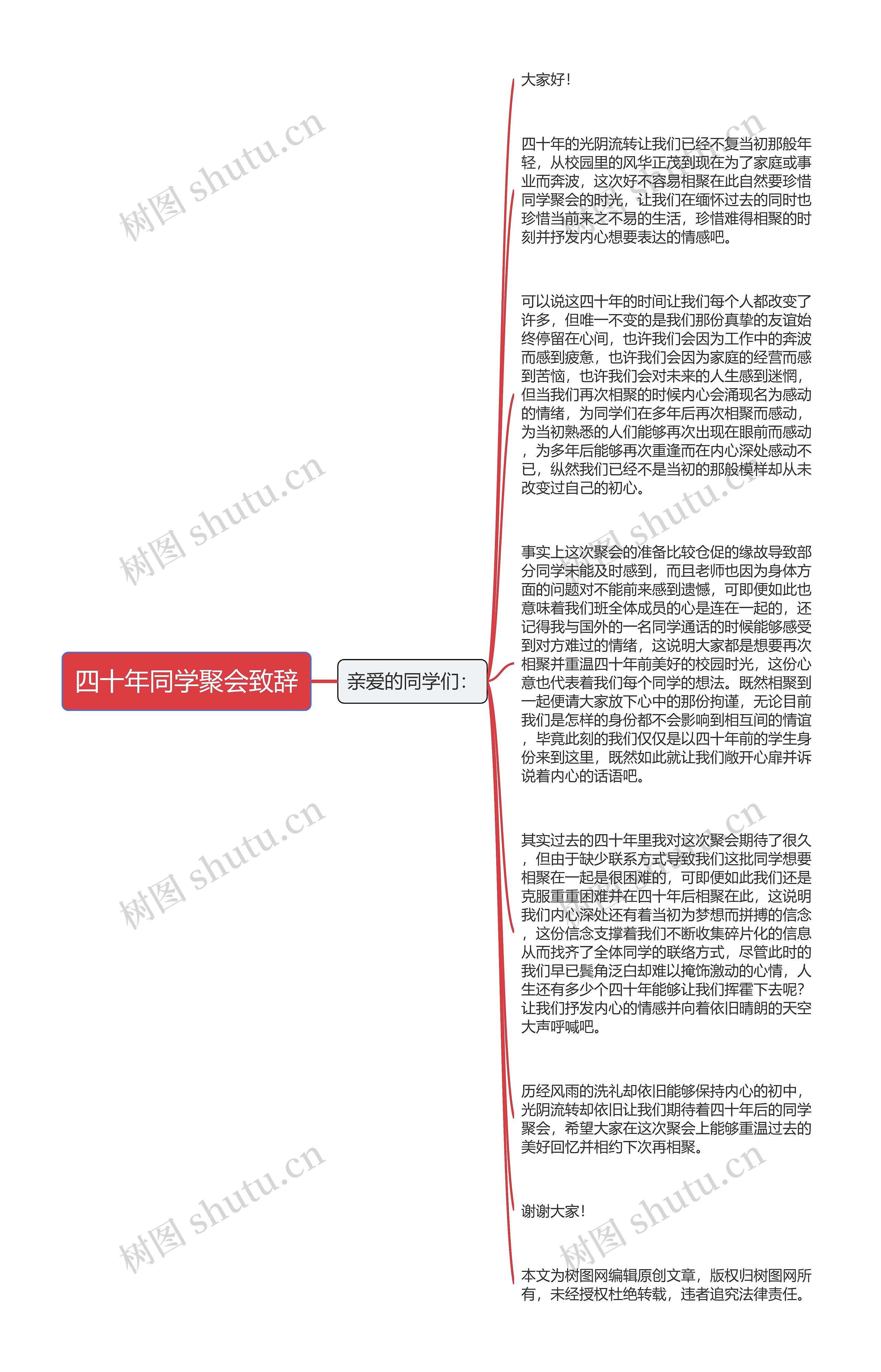 事实上这次聚会的准备比较仓促的缘故导致部分同学未能及时感到,而且老师也因为身体方面的问题对不能前来感到遗憾,可即便如此也意味着我们班全体成员的心是连在一起的,还记得我与国外的一名同学通话的时候能够感受到对方难过的情绪,这说明大家都是想要再次相聚并重温四十年前美好的校园时光,这份心意也代表着我们每个同学的想法。既然相聚到一起便请大家放下心中的那份拘谨,无论目前我们是怎样的身份都不会影响到相互间的情谊,毕竟此刻的我们仅仅是以四十年前的学生身份来到这里,既然如此就让我们敞开心扉并诉说着内心的话语吧。