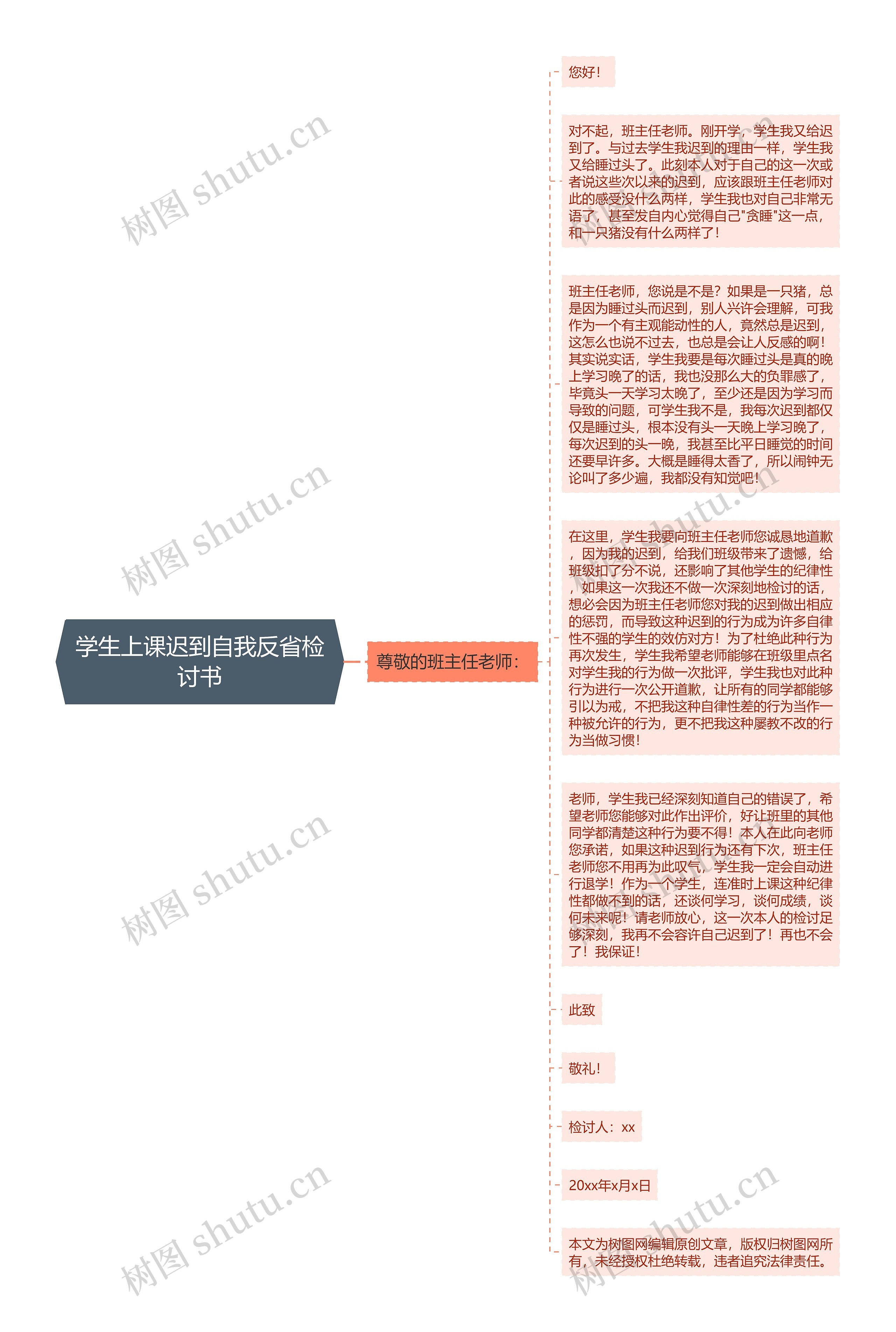 老师,学生我已经深刻知道自己的错误了,希望老师您能够对此作出评价,好让班里的其他同学都清楚这种行为要不得!本人在此向老师您承诺,如果这种迟到行为还有下次,班主任老师您不用再为此叹气,学生我一定会自动进行退学!作为一个学生,连准时上课这种纪律性都做不到的话,还谈何学习,谈何成绩,谈何未来呢!请老师放心,这一次本人的检讨足够深刻,我再不会容许自己迟到了!再也不会了!我保证!
