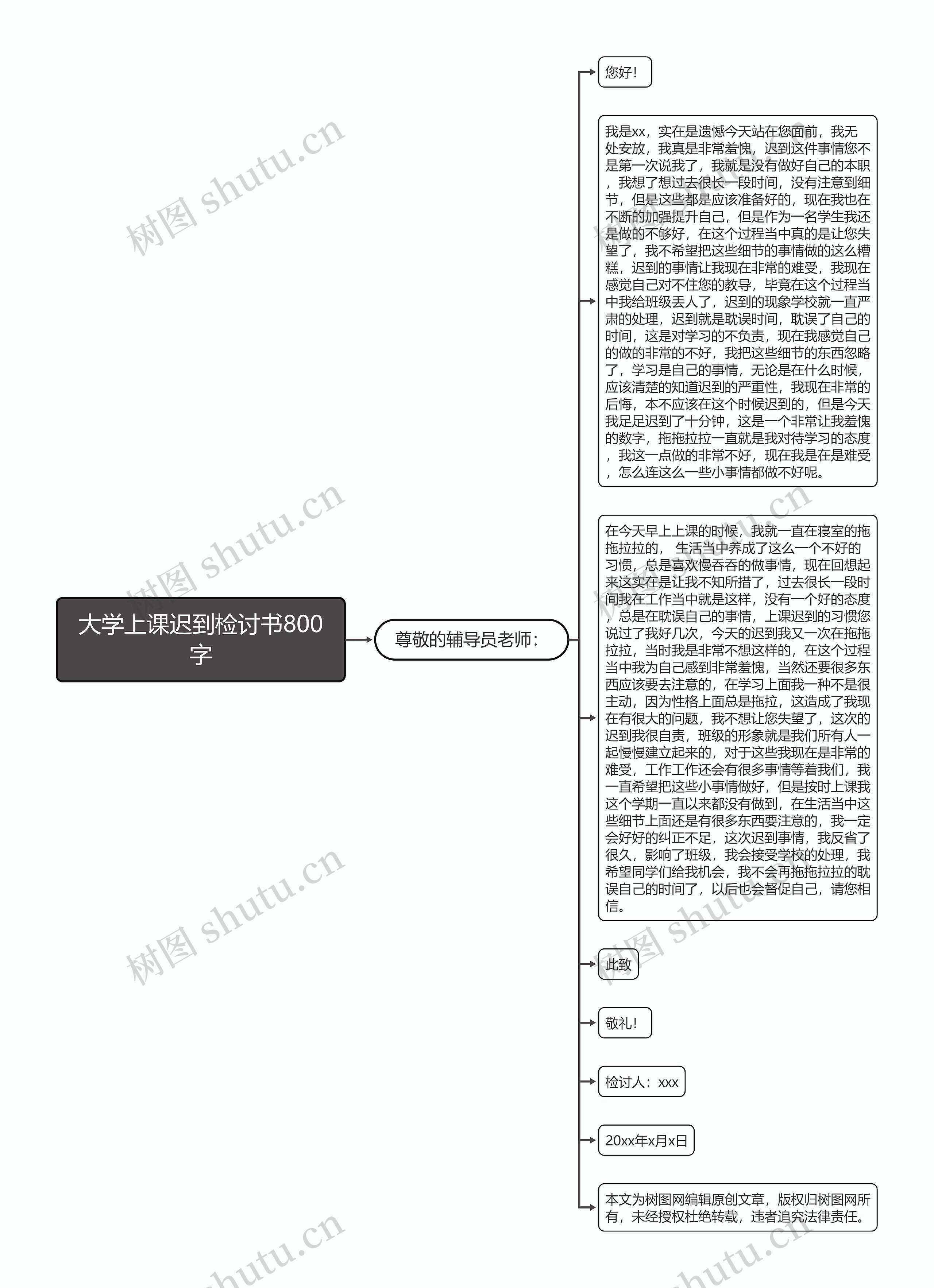 树图思维导图提供《大学上课迟到检讨书800字》在线思维导图免费制作,点击“编辑”按钮,可对《大学上课迟到检讨书800字》进行在线思维导图编辑,本思维导图属于思维导图模板主题,文件编号是:a223ec857eb1abbfa1009f844f5fe6fa