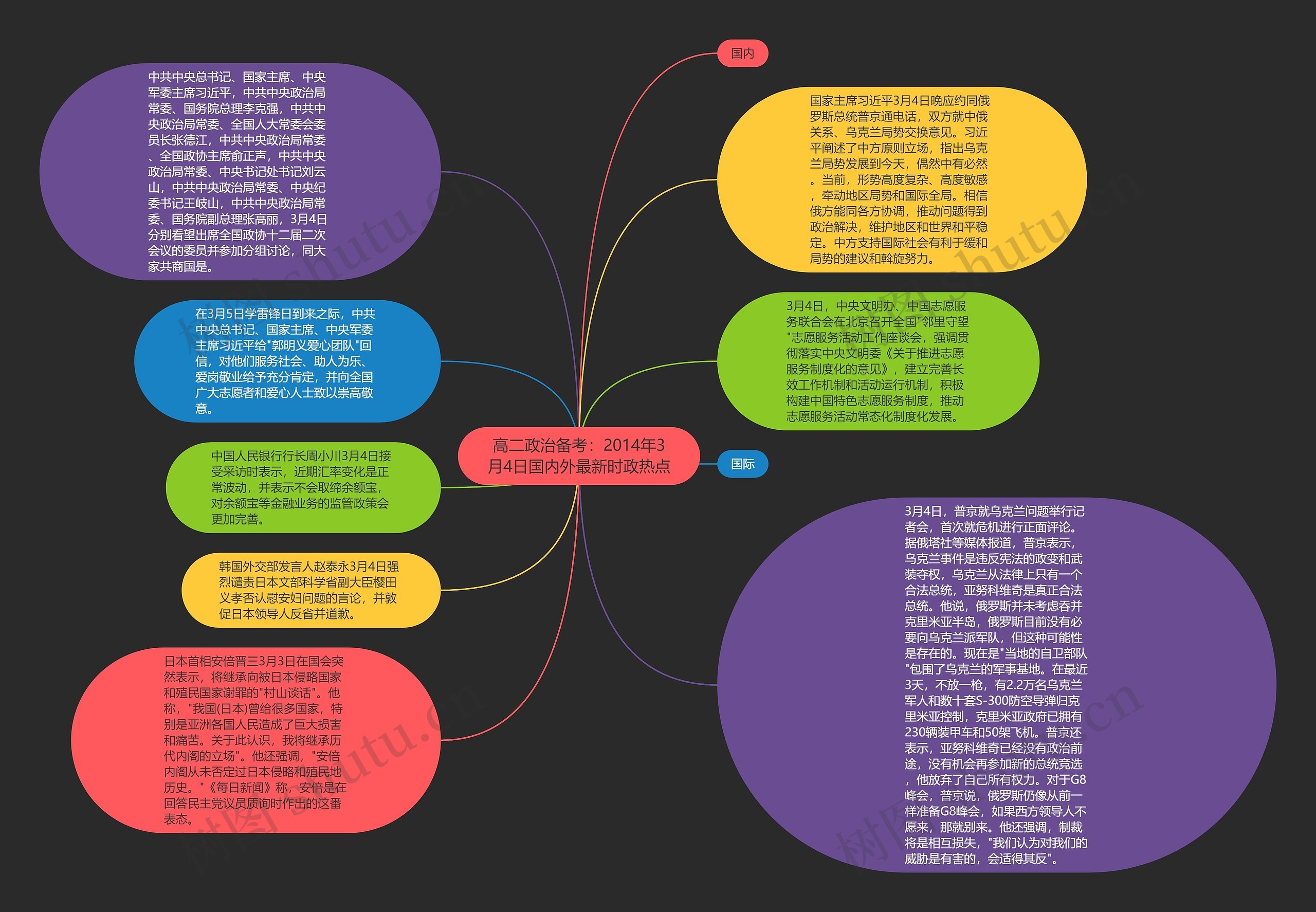 国家主席习近平3月4日晚应约同俄罗斯总统普京通电话,双方就中俄关系、乌克兰局势交换意见。习近平阐述了中方原则立场,指出乌克兰局势发展到今天,偶然中有必然。当前,形势高度复杂、高度敏感,牵动地区局势和国际全局。相信俄方能同各方协调,推动问题得到政治解决,维护地区和世界和平稳定。中方支持国际社会有利于缓和局势的建议和斡旋努力。