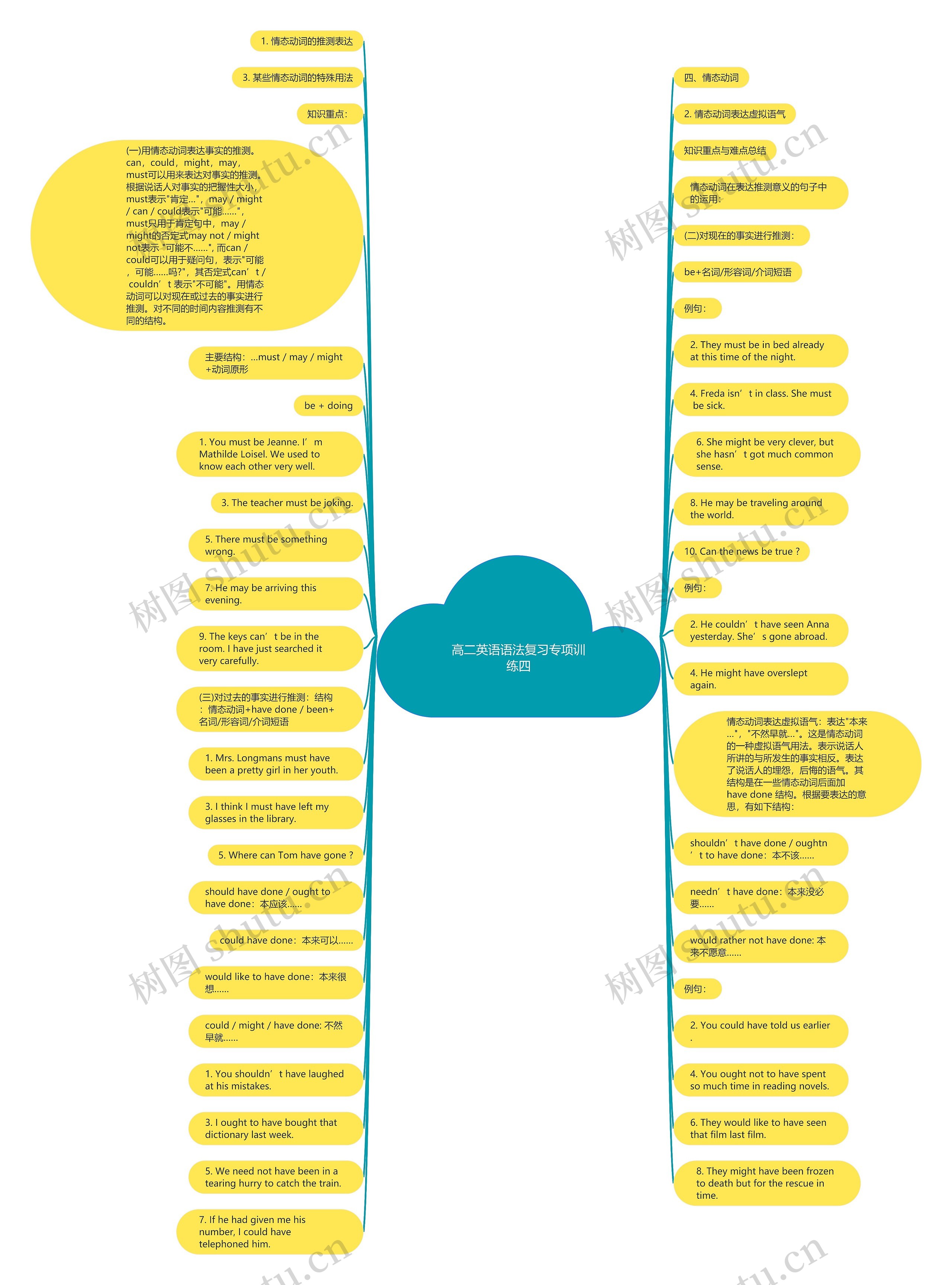 (一)用情态动词表达事实的推测。can,could,might,may,must可以用来表达对事实的推测。根据说话人对事实的把握性大小,must表示"肯定…",may / might / can / could表示"可能……", must只用于肯定句中,may / might的否定式may not / might not表示 "可能不……", 而can / could可以用于疑问句,表示"可能,可能……吗?",其否定式can’t / couldn’t 表示"不可能"。用情态动词可以对现在或过去的事实进行推测。对不同的时间内容推测有不同的结构。