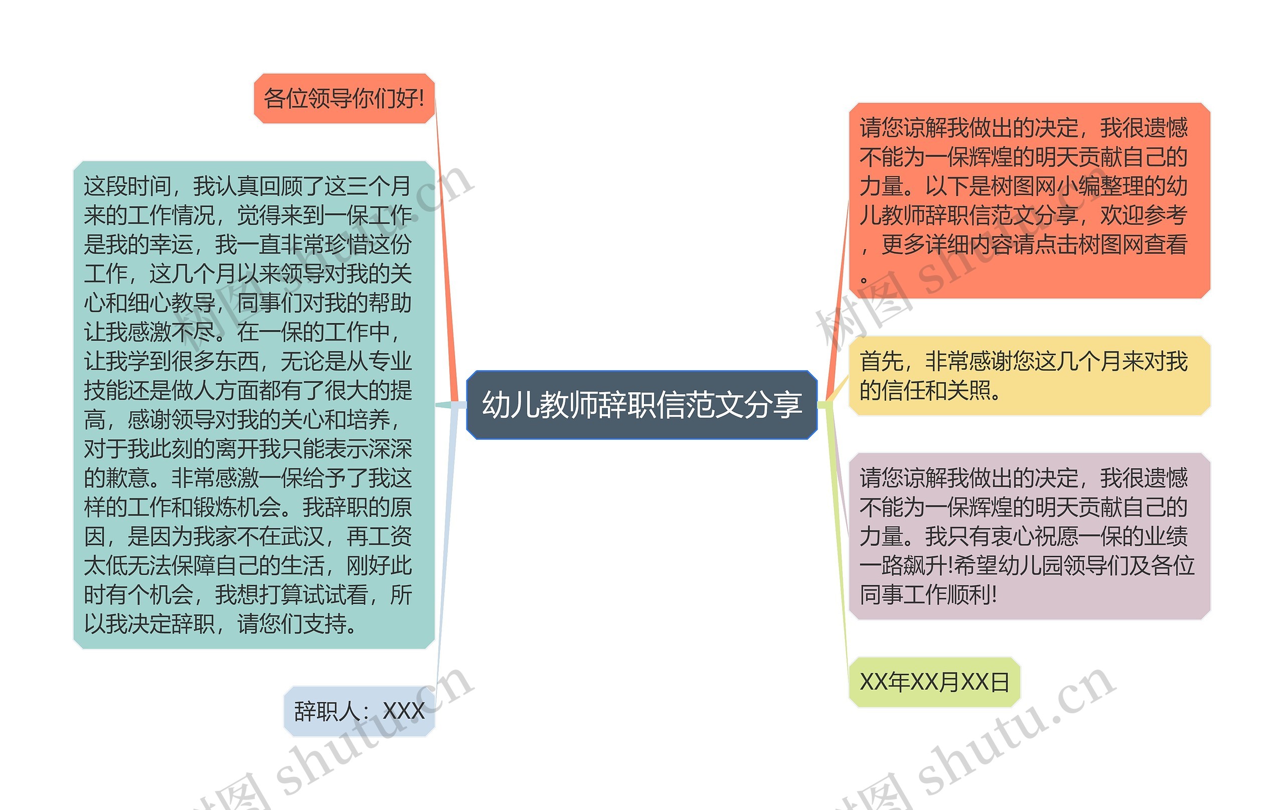 树图思维导图提供《幼儿教师辞职信范文分享》在线思维导图免费制作,点击“编辑”按钮,可对《幼儿教师辞职信范文分享》进行在线思维导图编辑,本思维导图属于思维导图模板主题,文件编号是:7d59d14dbbaa42fe1f93378f08e0adb8