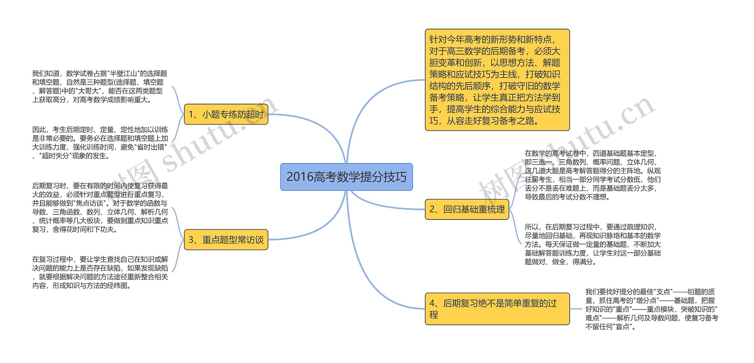 朋友们,在2016高考数学提分技巧思维导图中,有几个重要的知识点需要我们关注,我们要注重做选择题和填空题的训练,因为这两种题型占据了试卷的很大比重,要定时、定量地进行训练,避免超时失分,我们要重视基础题,包含三选一、三角数列、概率问题和立体几何。这些题是解答题中得分的主要部分,所以我们要加强复习,做对、做全,保证得到满分,还有,在复习的过程中,要重点访谈重点题型,如函数与导数、三角函数、数列、立体几何。要找出自己在知识和解题能力上的缺陷,并重新整合相关内容,形成知识和方法的经纬图。后期复习并不是简单重复的过程,要抓住组题质量的提分支点,把握基础题的增分点,掌握知识重点和难点,特别是解析几何和导数问题,确保复习备考没有任何盲点。让我们大胆变革和创新,从容走好复习备考之路吧!